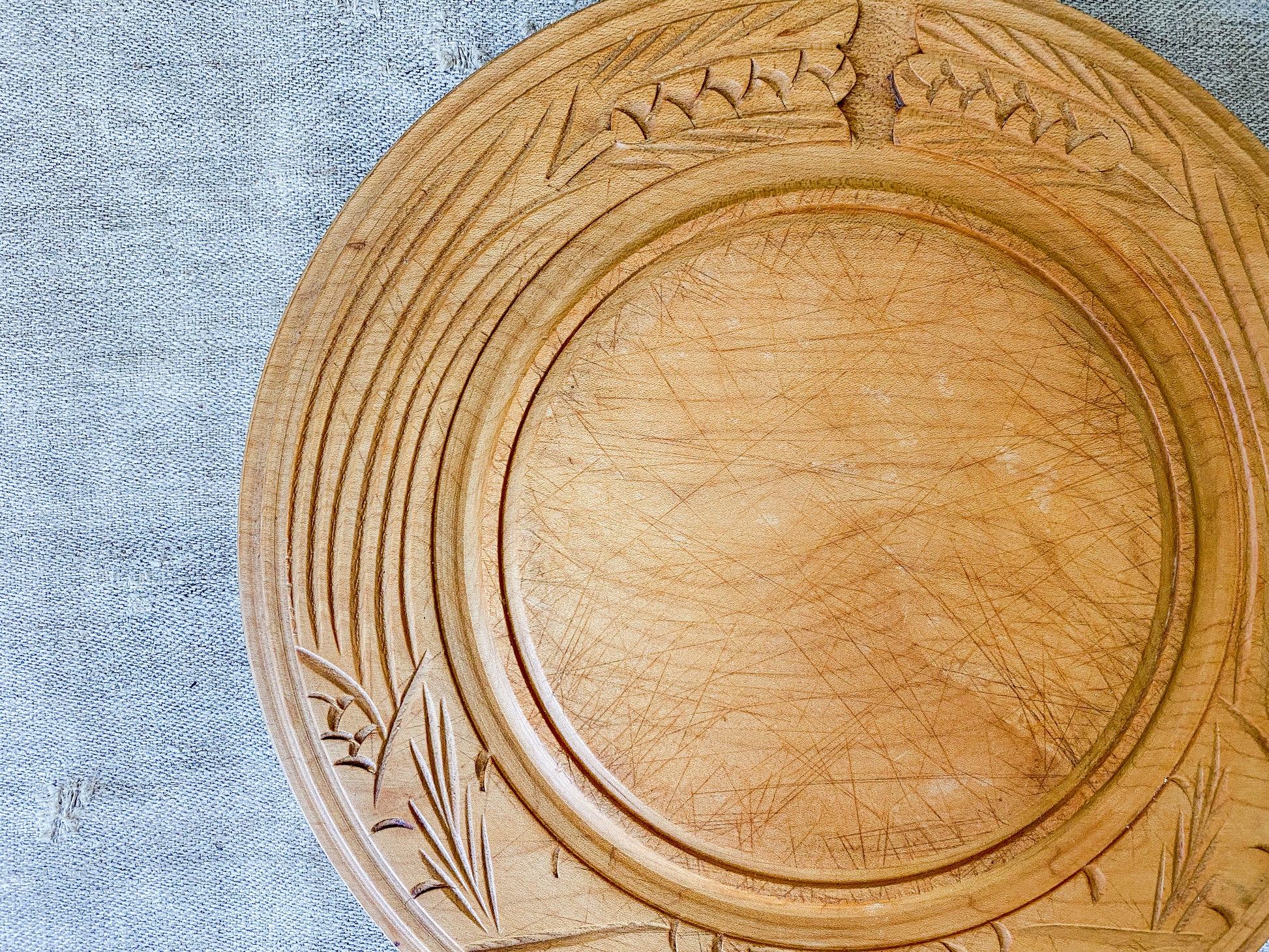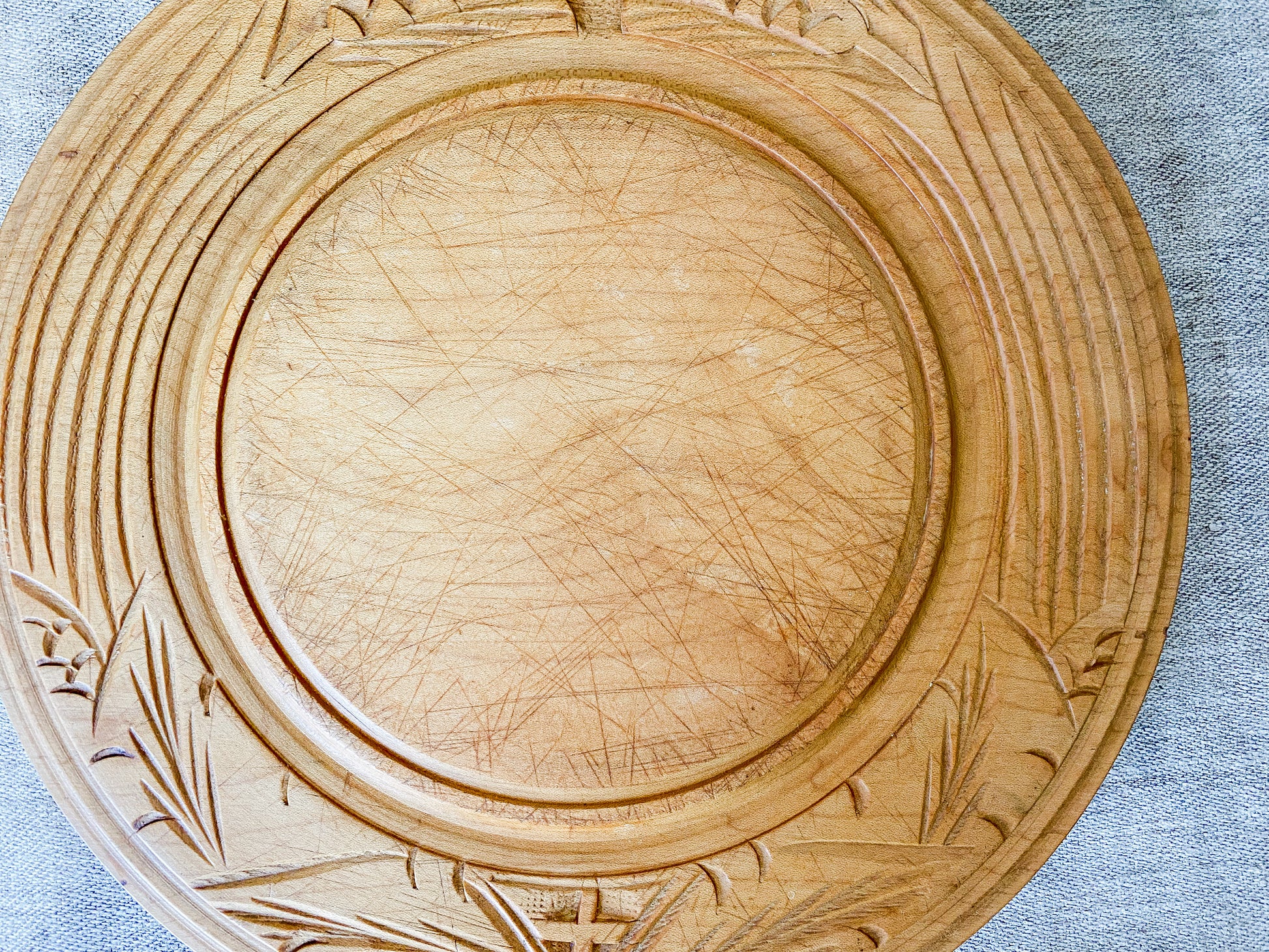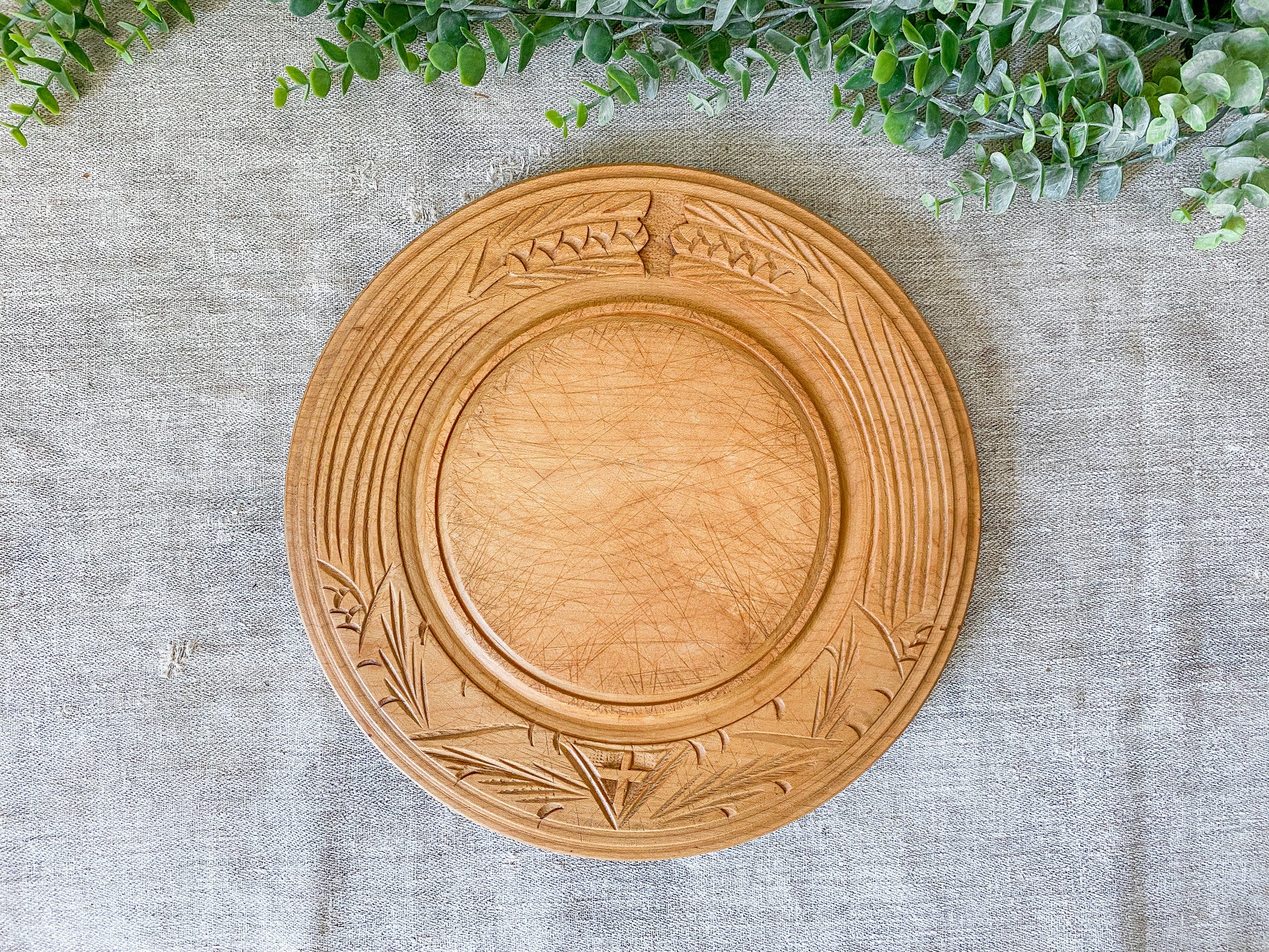 Available is a deeply carved vintage English bread board. The wide border has detailed wheat heads curving to the top. The bottom has leaves bracketing a cross. Beautiful medium honey gold wood tones. Light knife marks and wear across the surface.