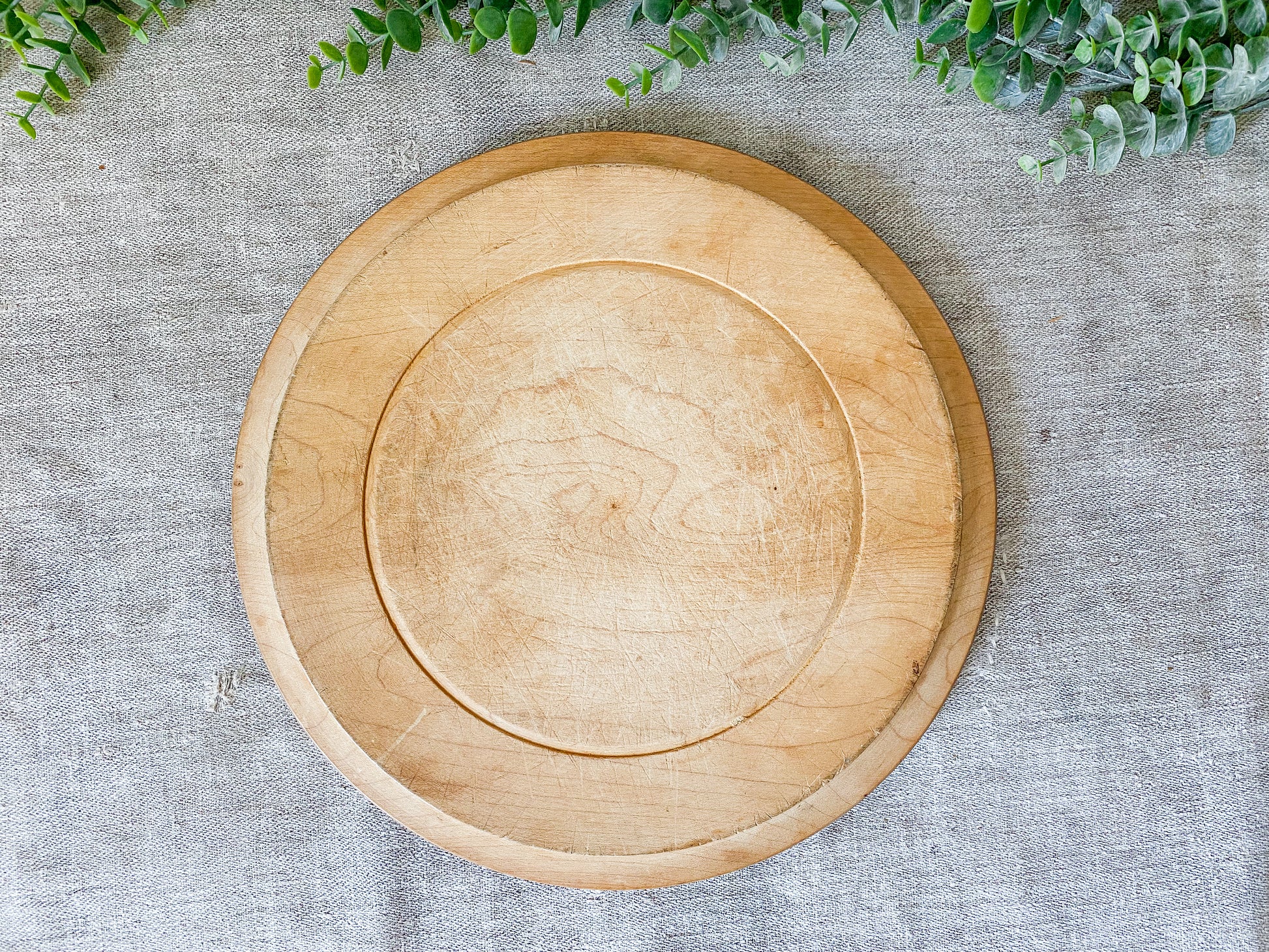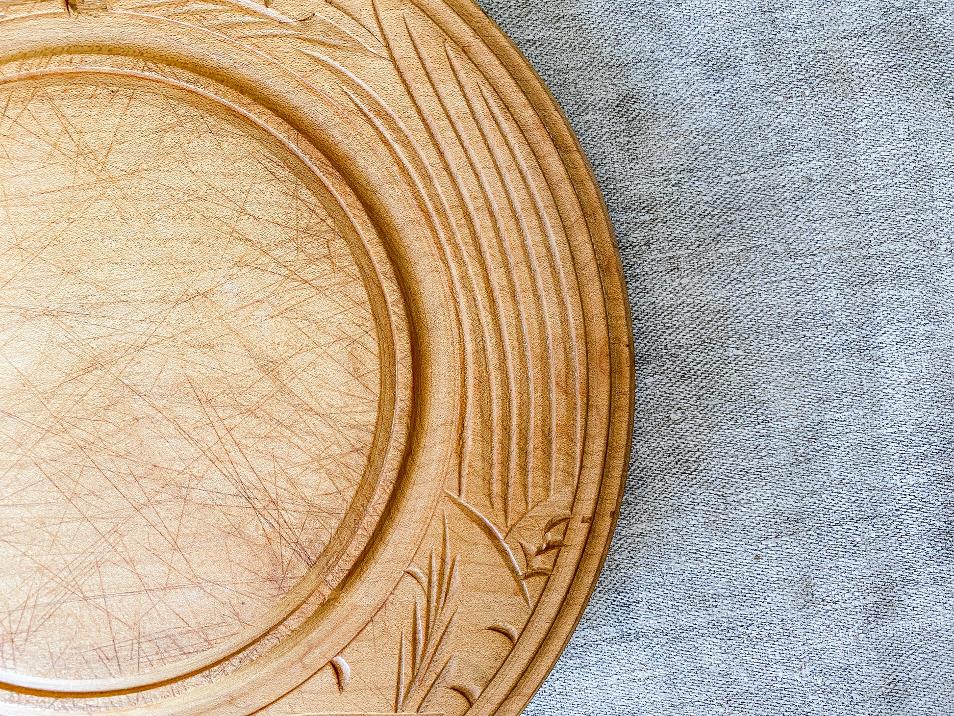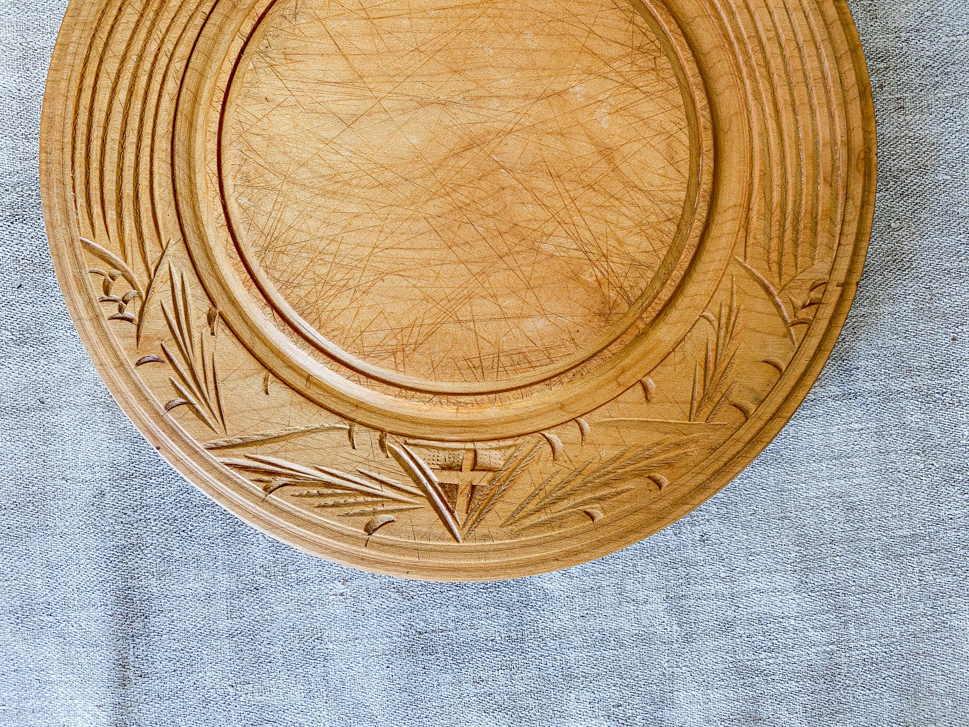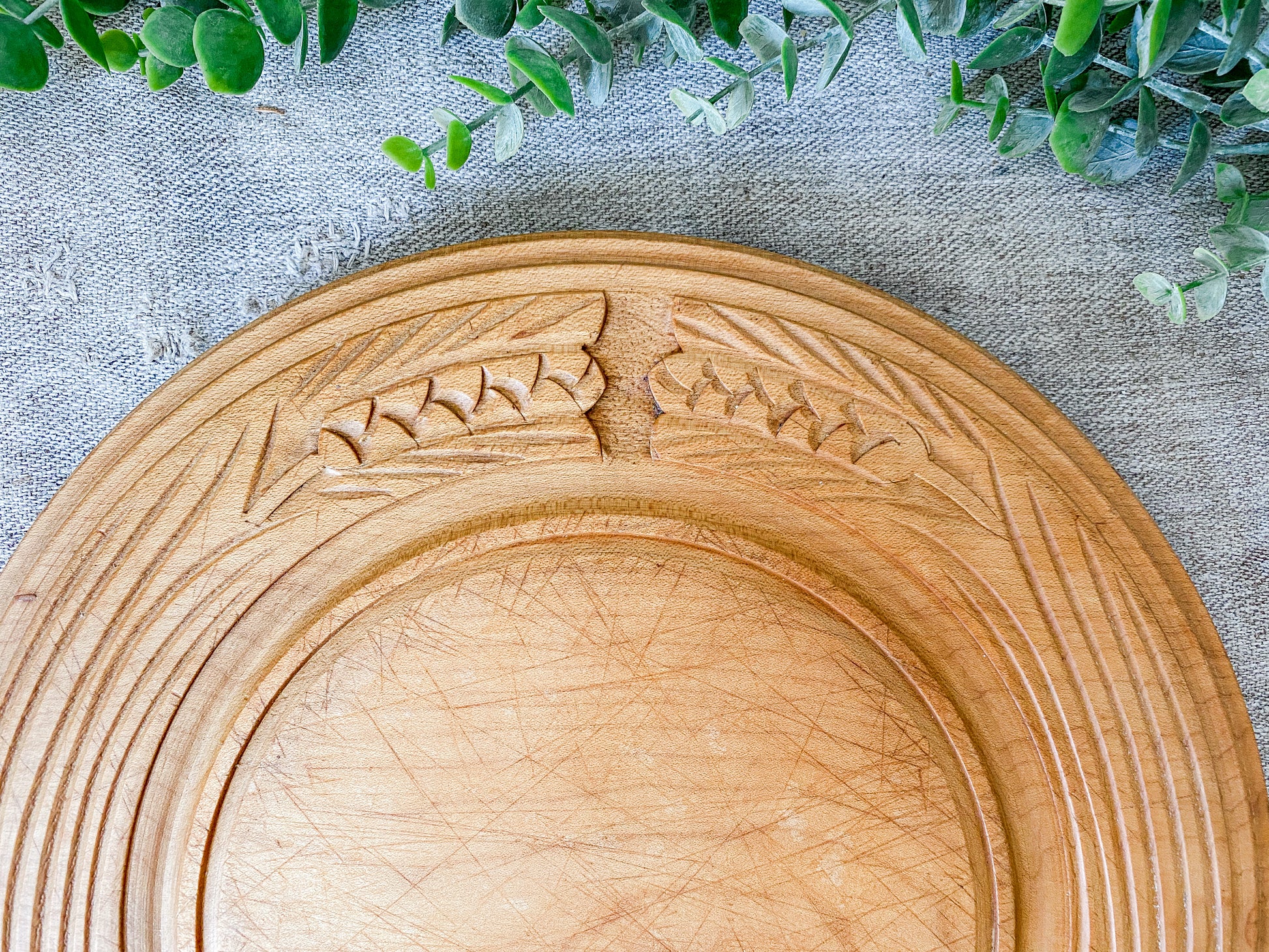 Available is a deeply carved vintage English bread board. The wide border has detailed wheat heads curving to the top. The bottom has leaves bracketing a cross. Beautiful medium honey gold wood tones. Light knife marks and wear across the surface.