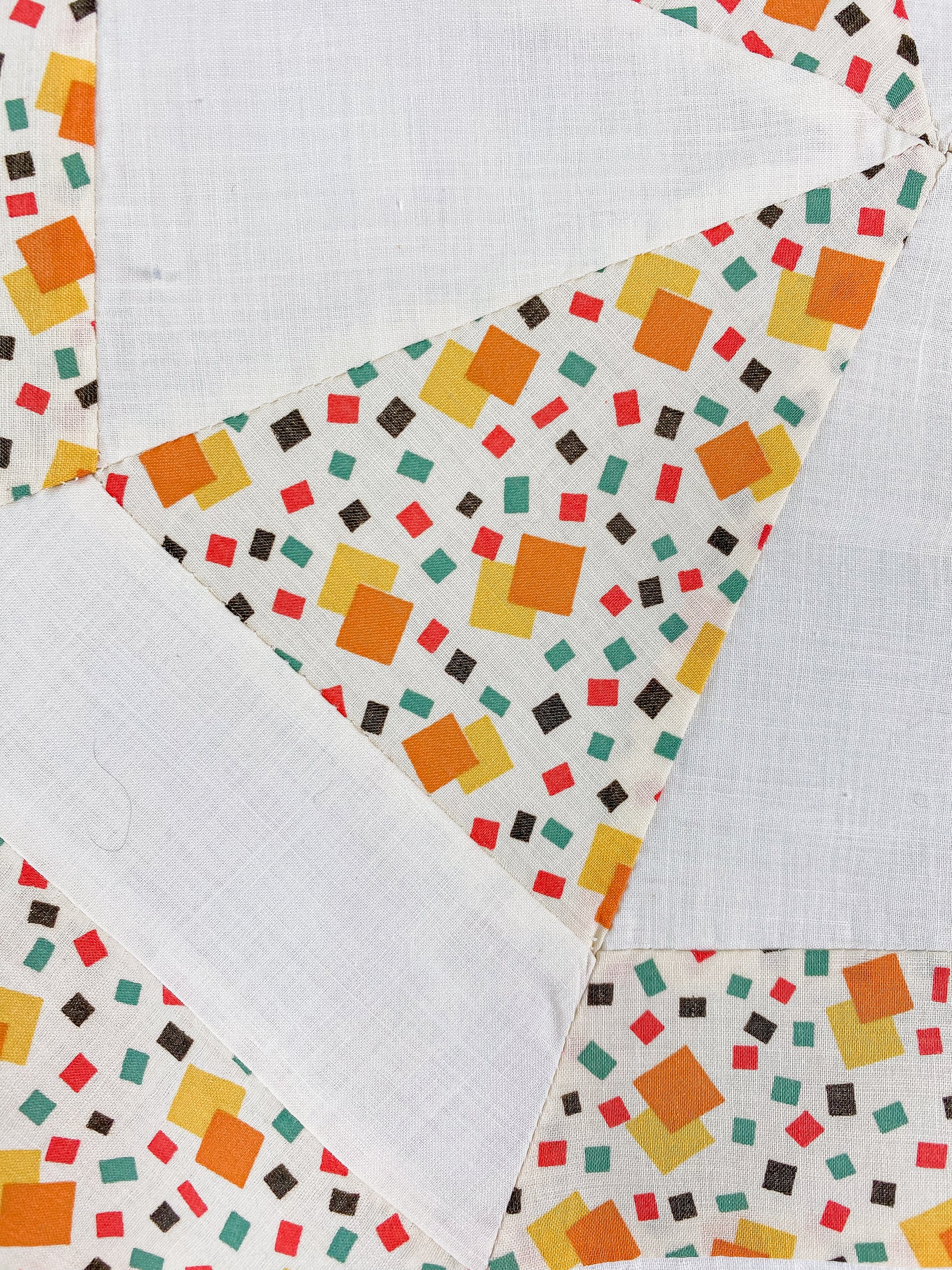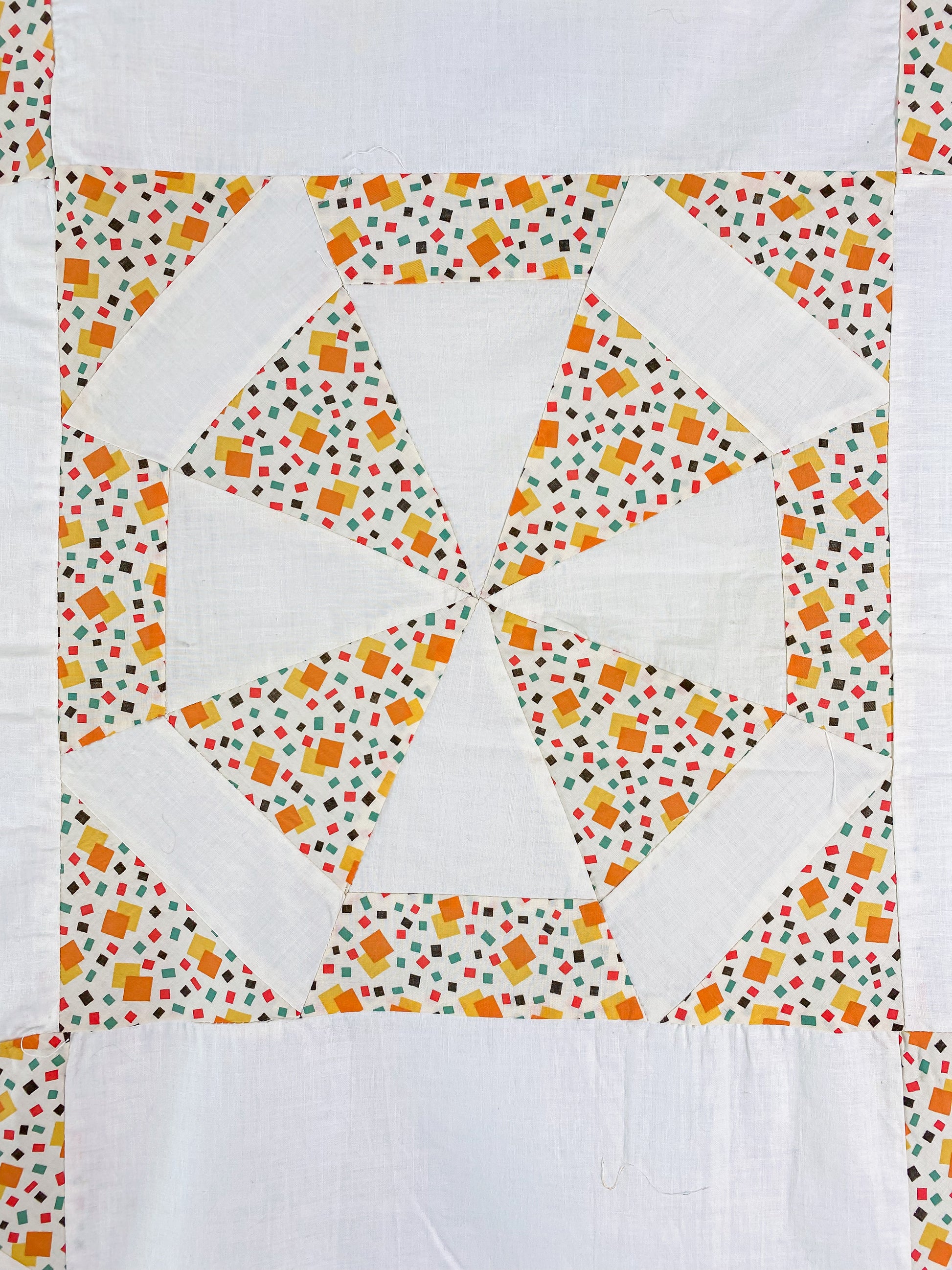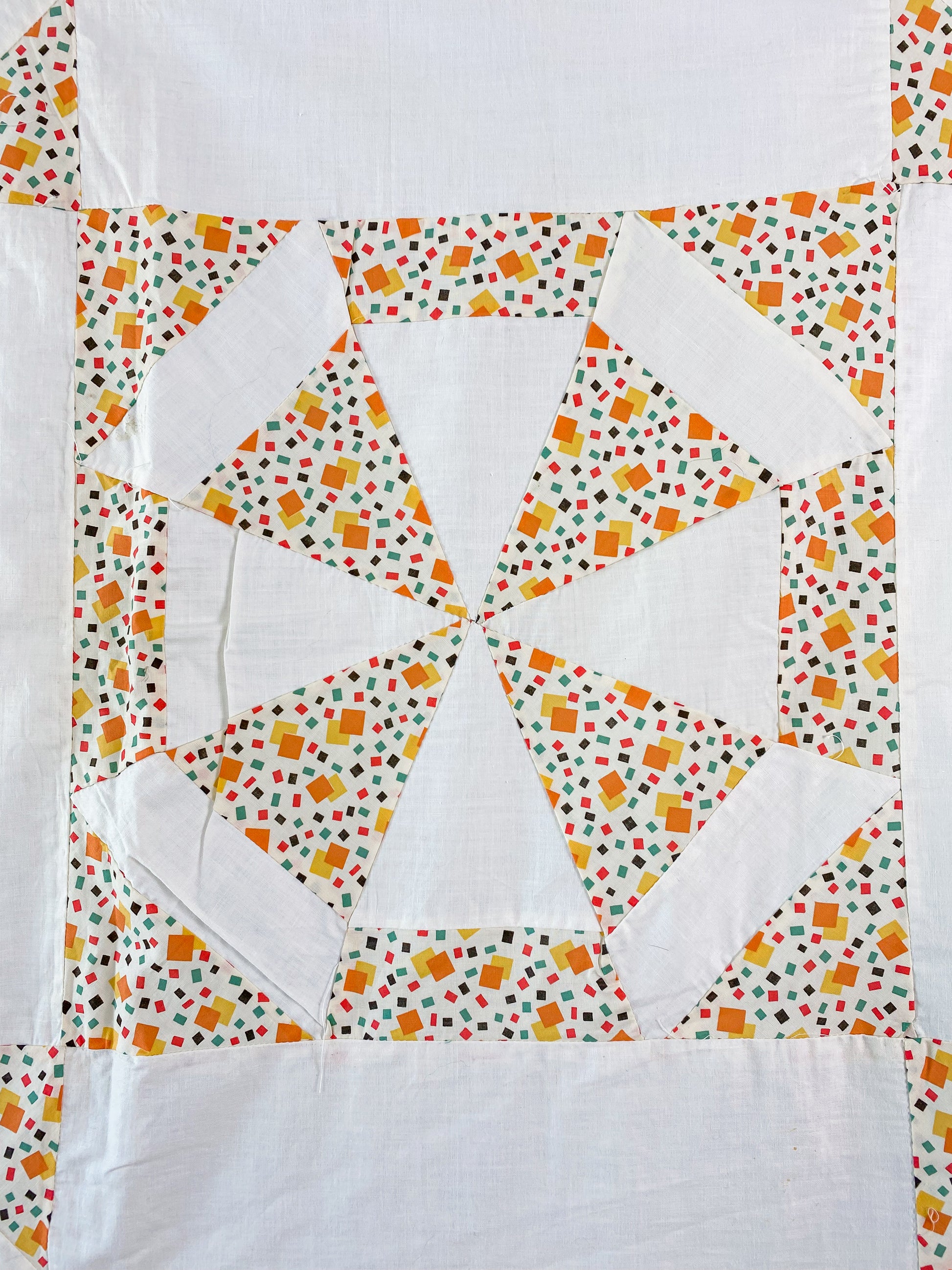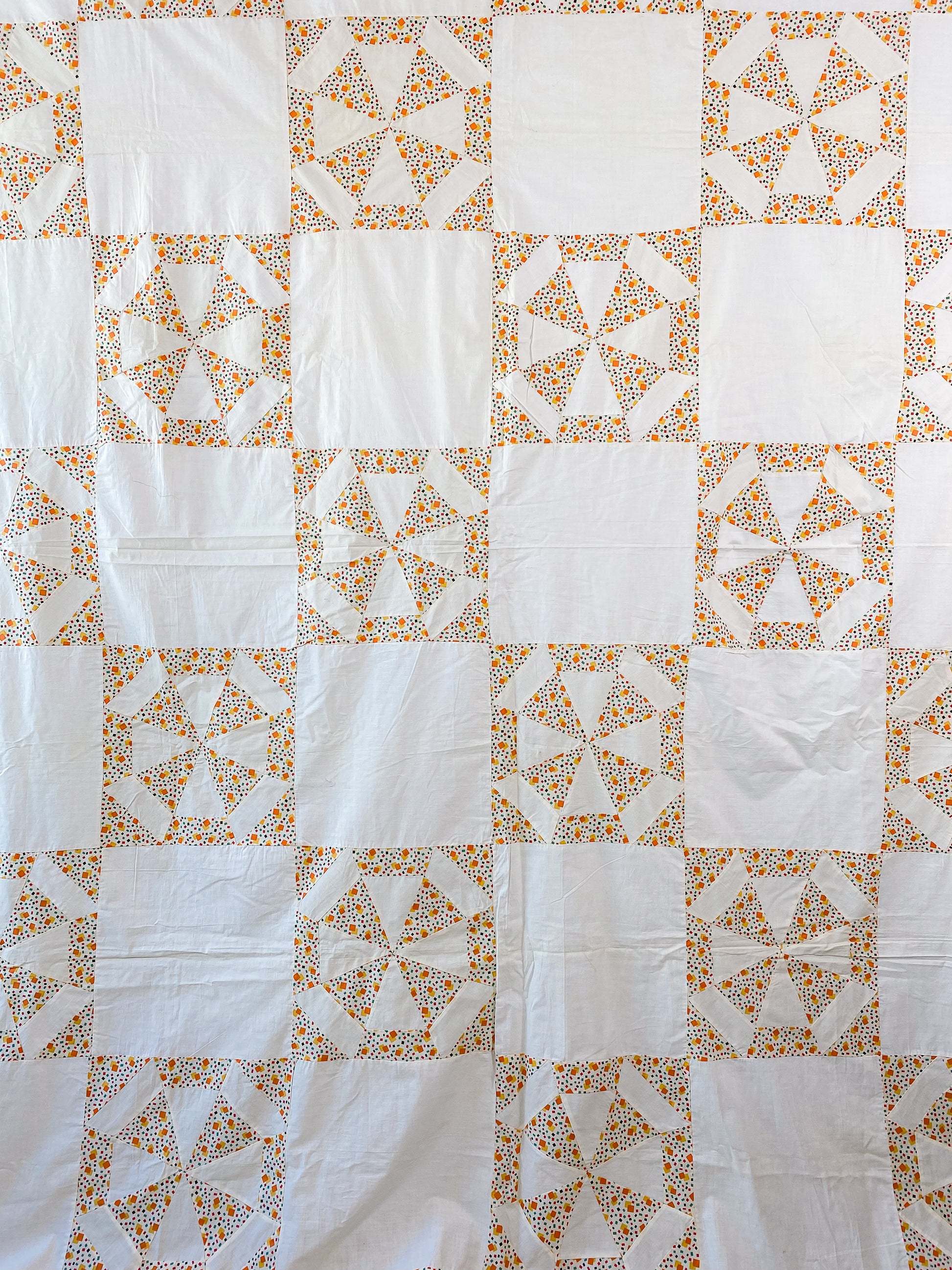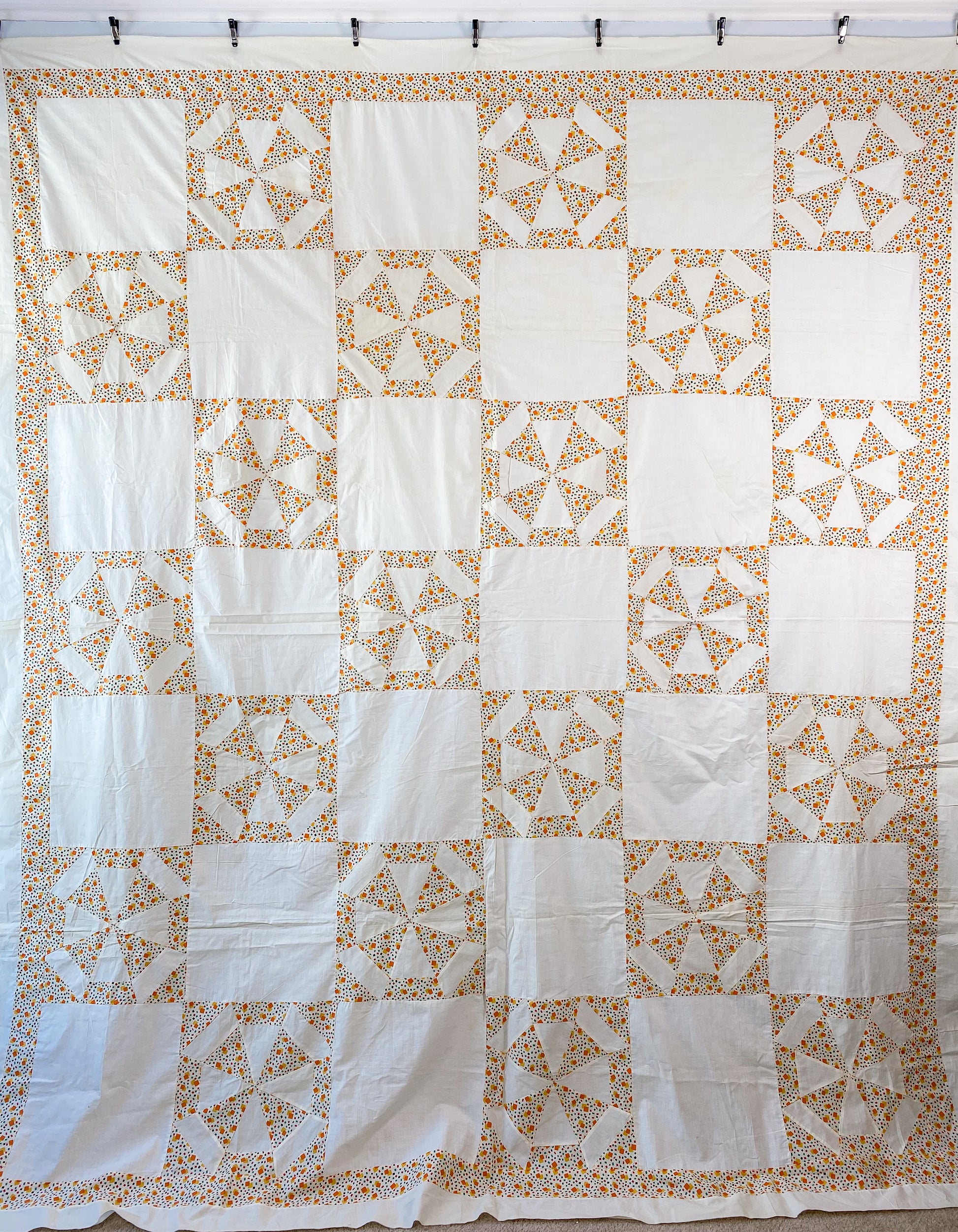 The quilt top is in the Spider Web, or Hexagonal Beauty, pattern, with white fabric setting patches of printed yellow and orange squares with smaller dark squares. Wide border of the same fabric. Machine pieced with white thread.