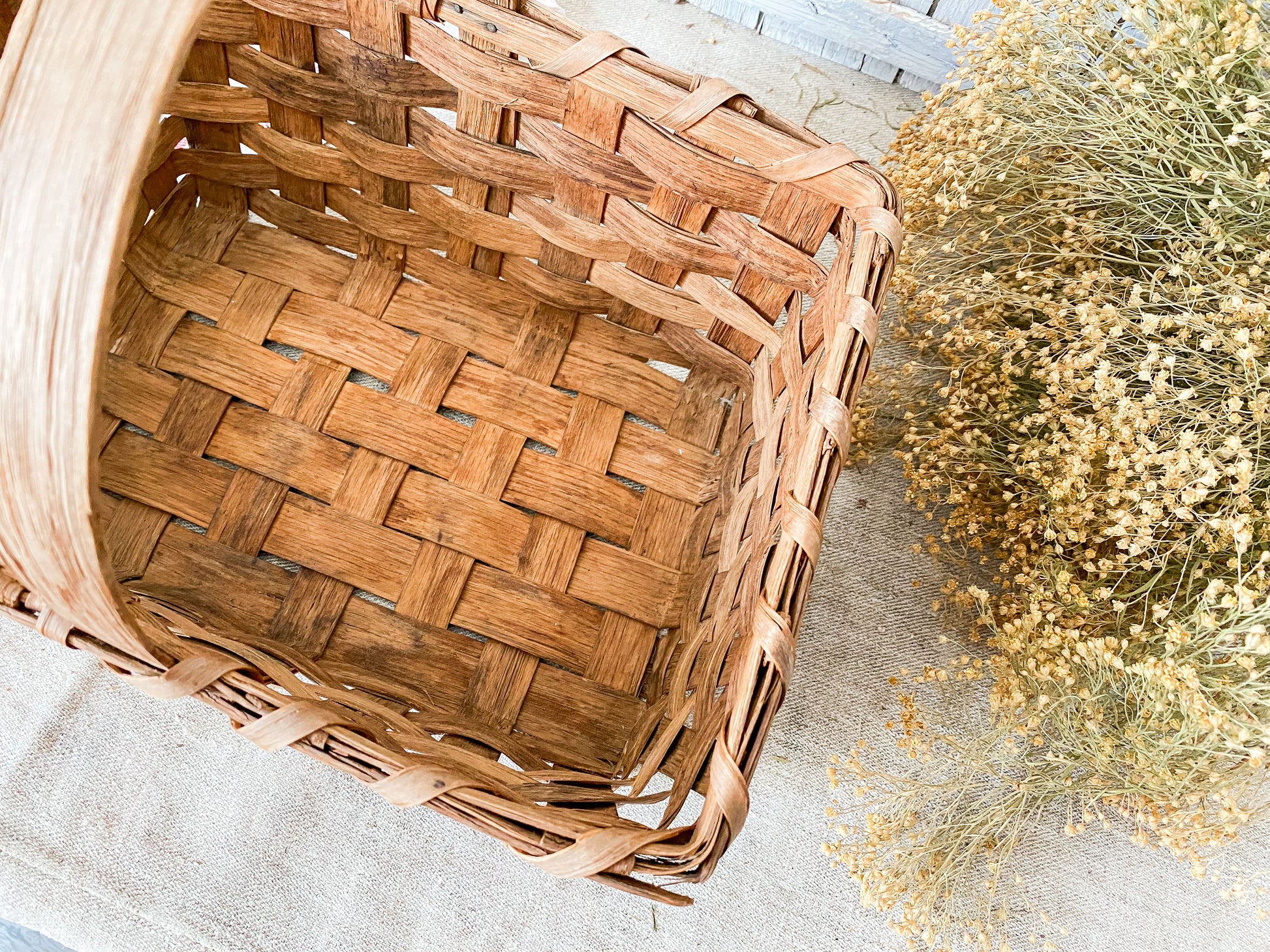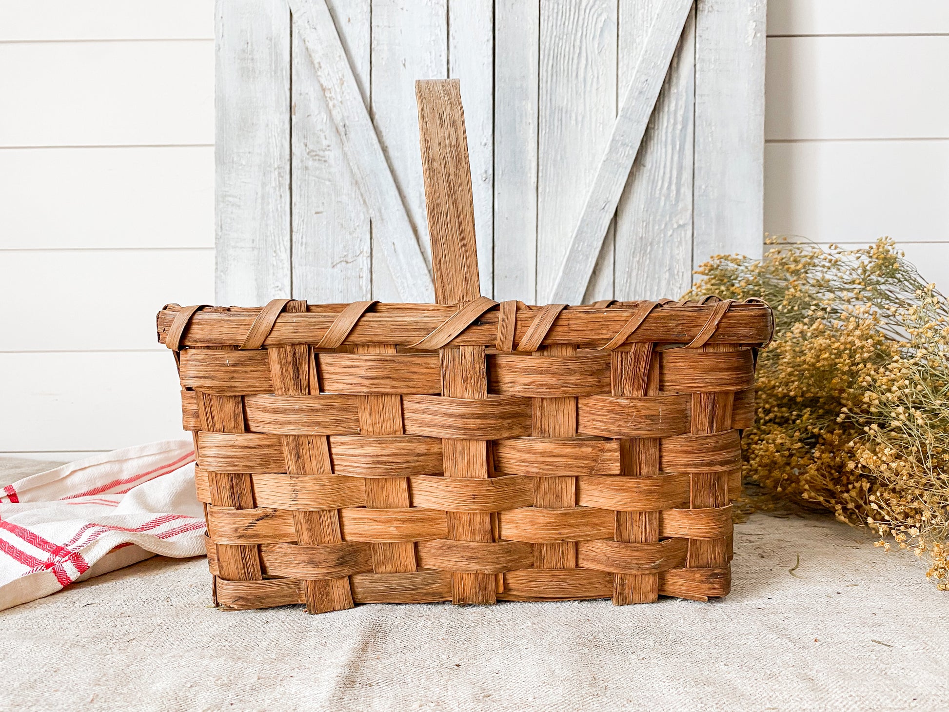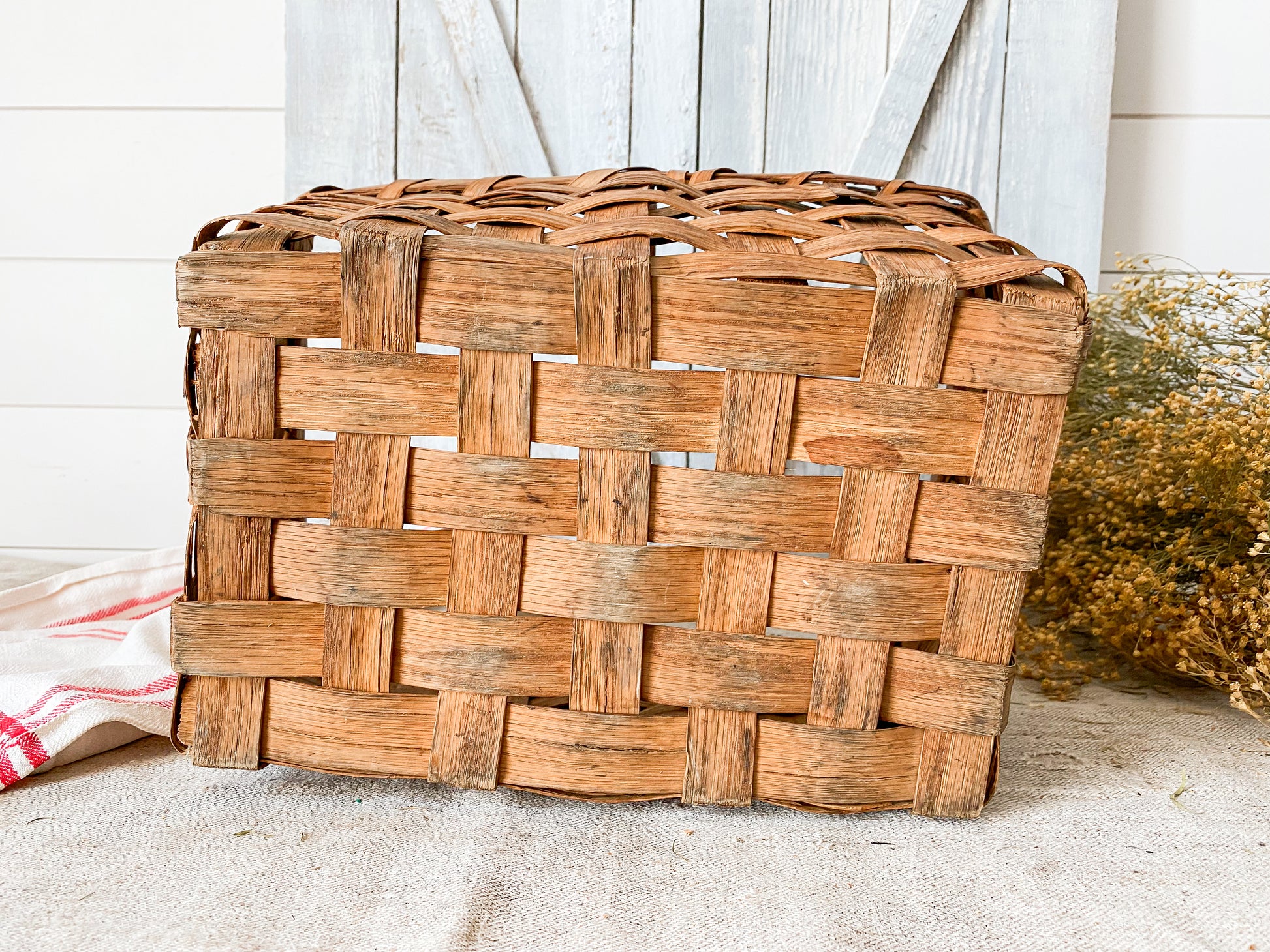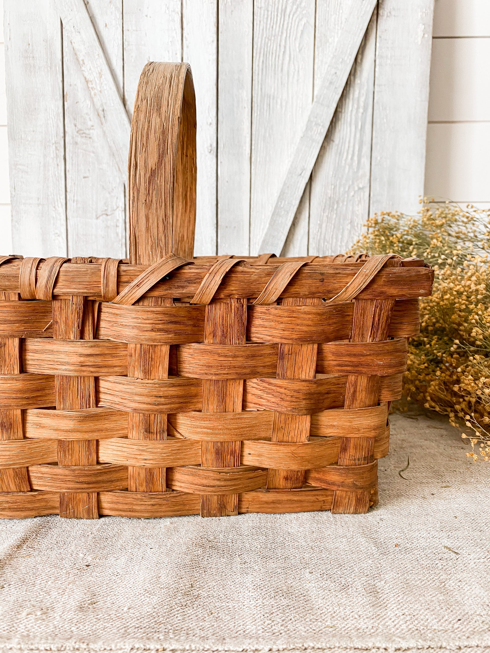 Vintage woven split wood oak basket with bent wood handle in rectangle shape - perfect size for decorating in small spaces.