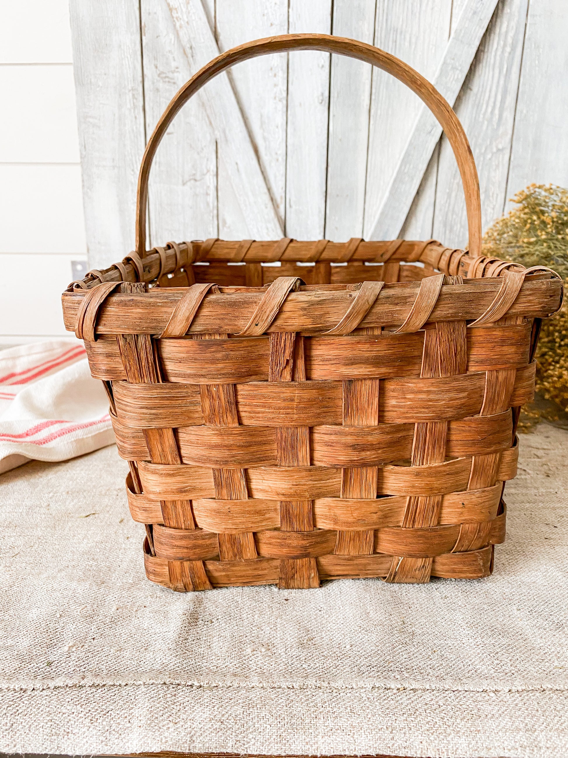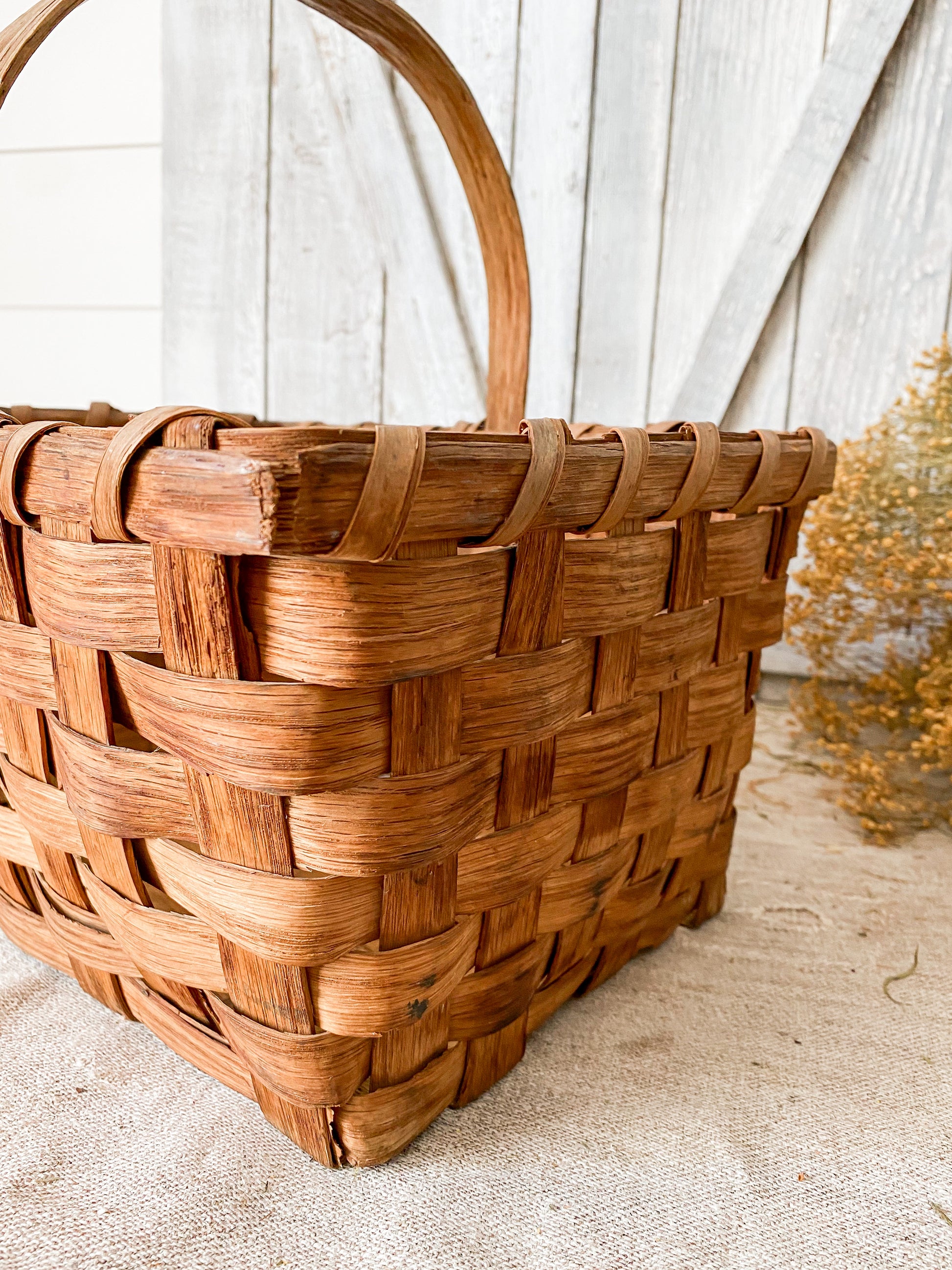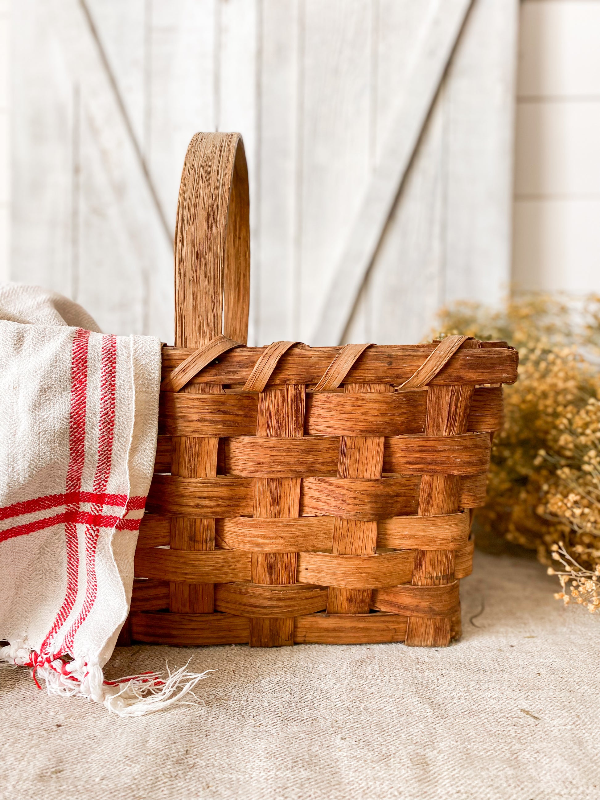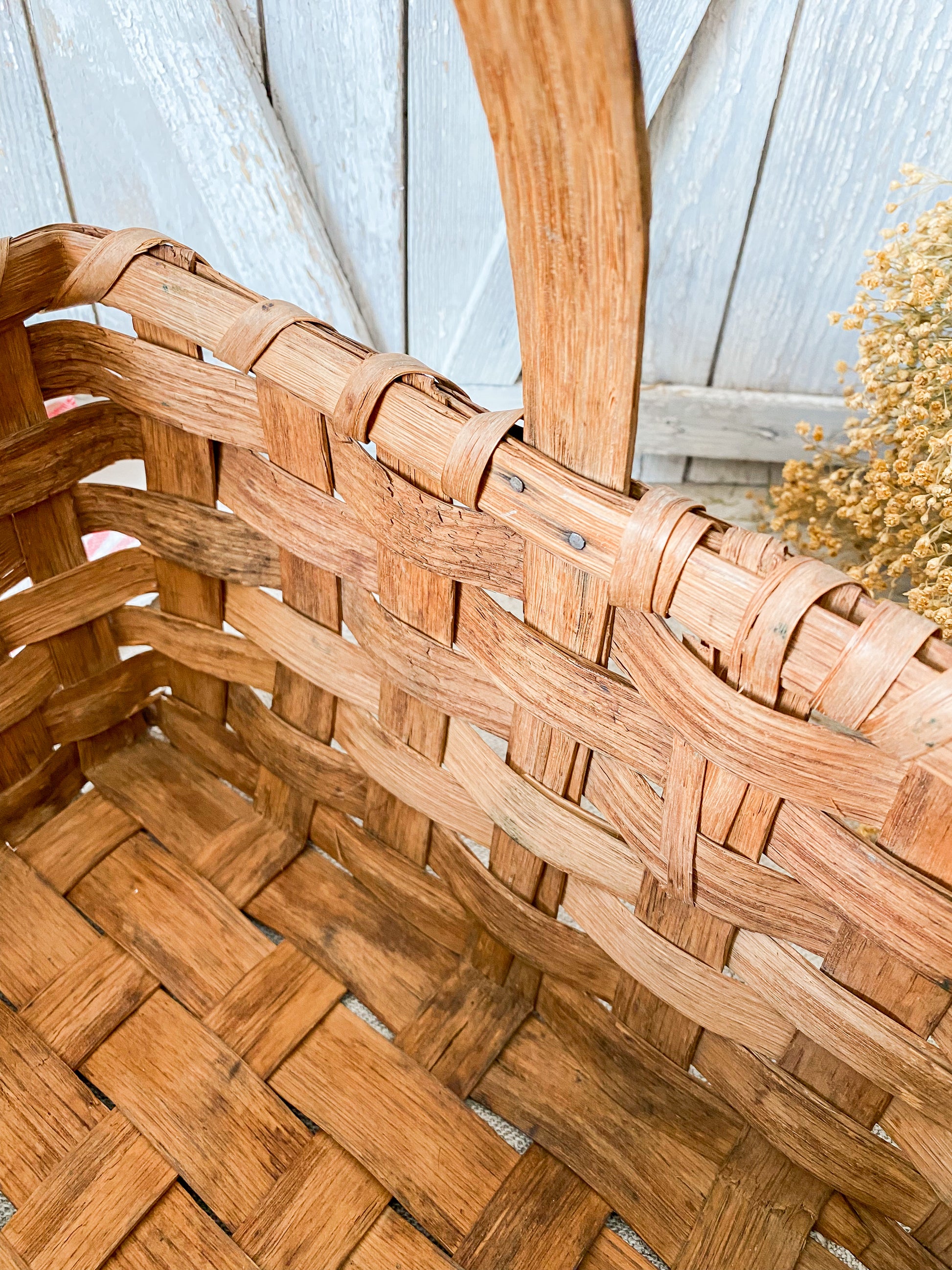 Vintage woven split wood oak basket with bent wood handle in rectangle shape - perfect size for decorating in small spaces.