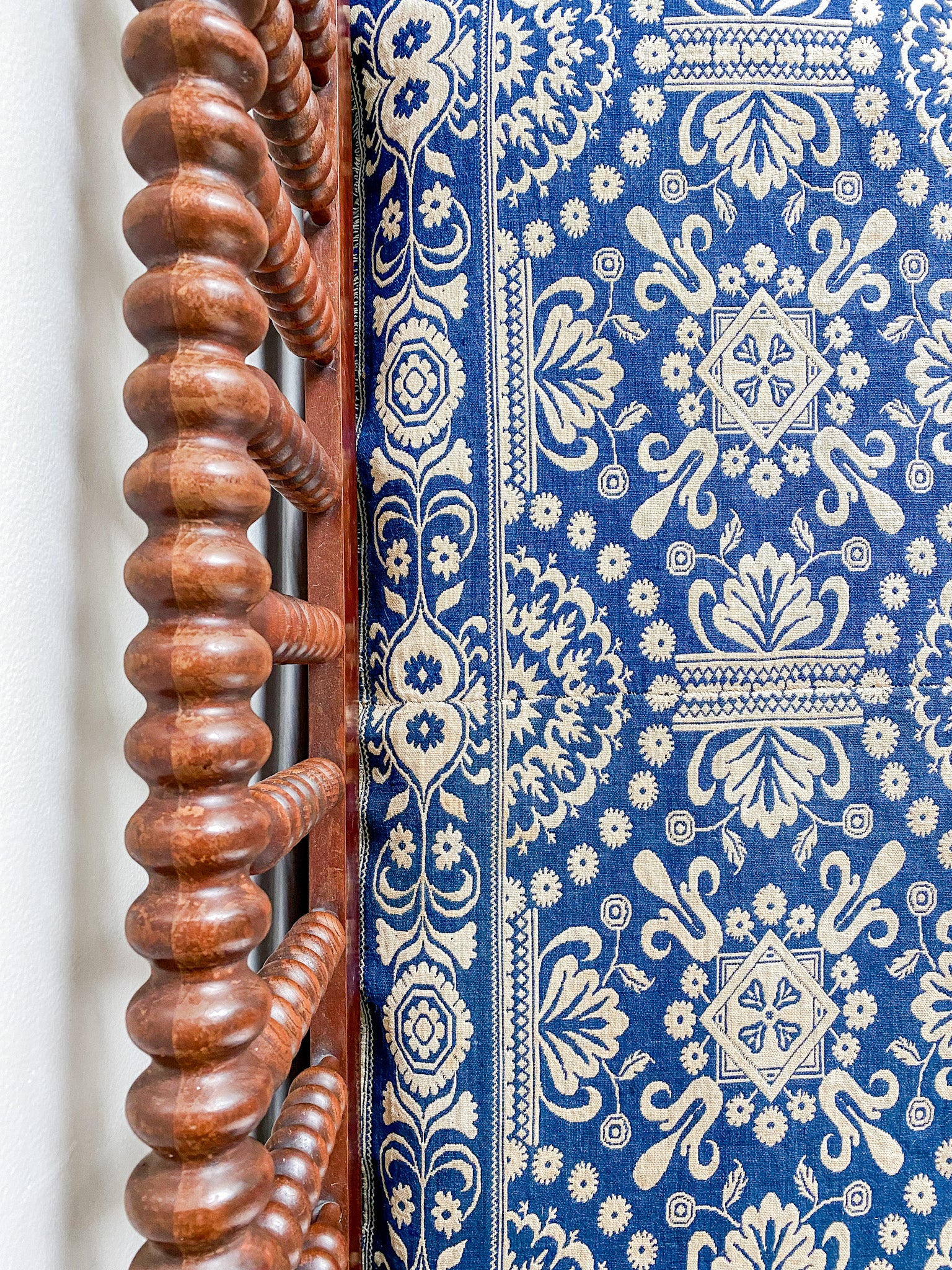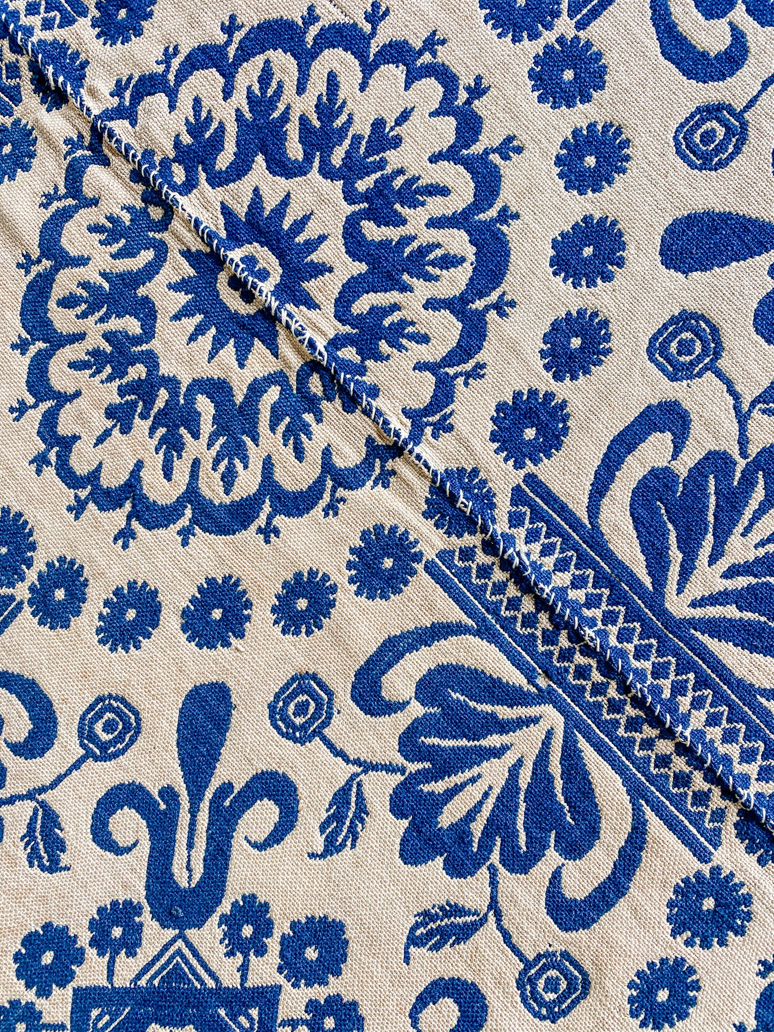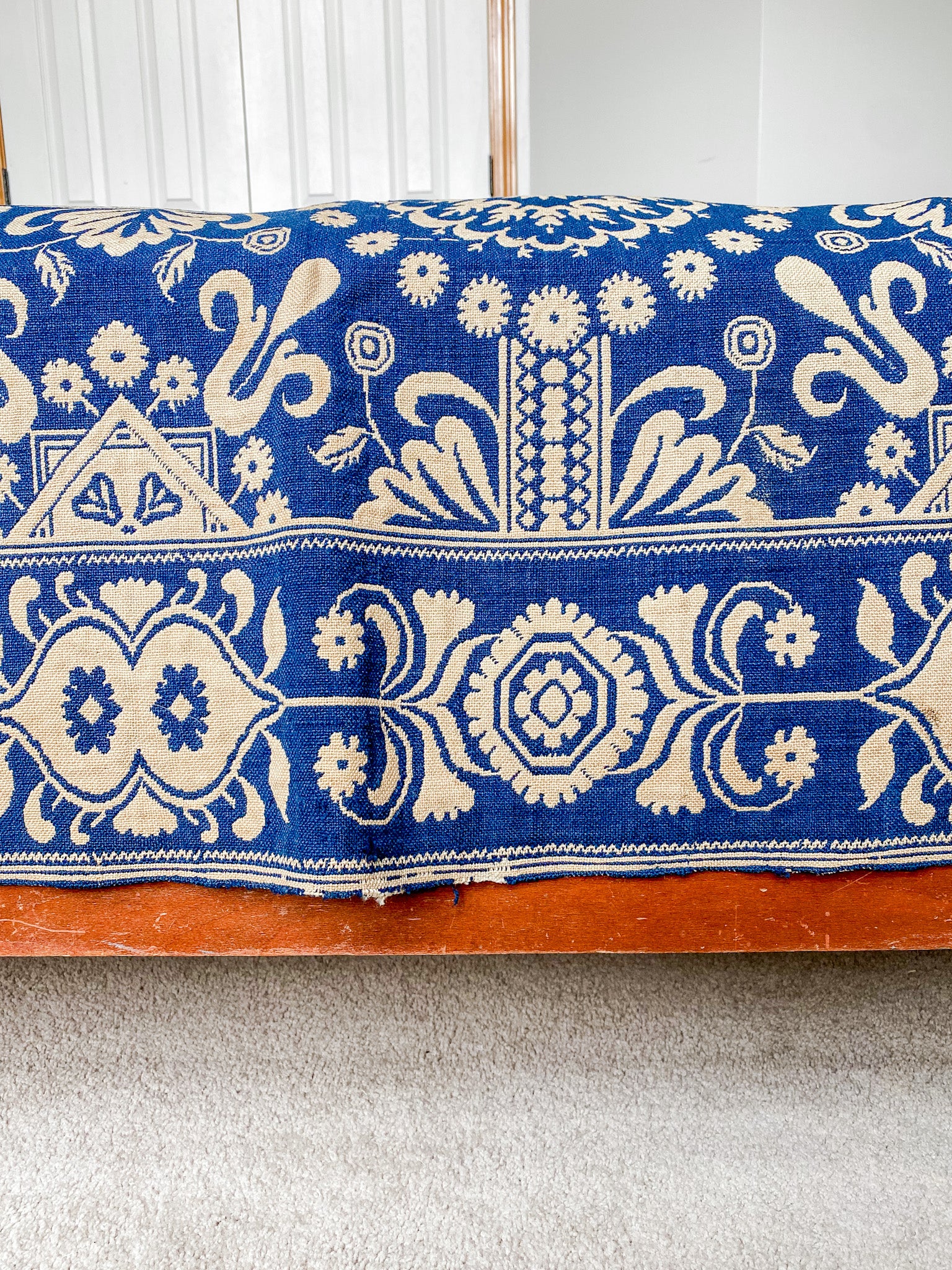 Good antique condition. There are several worn areas of weaving. Heavy staining along edges that show up as darkened cream against the blue. Overall intact. It has been aired out but not washed. Great potential for display or repurposing. Please review all photos.