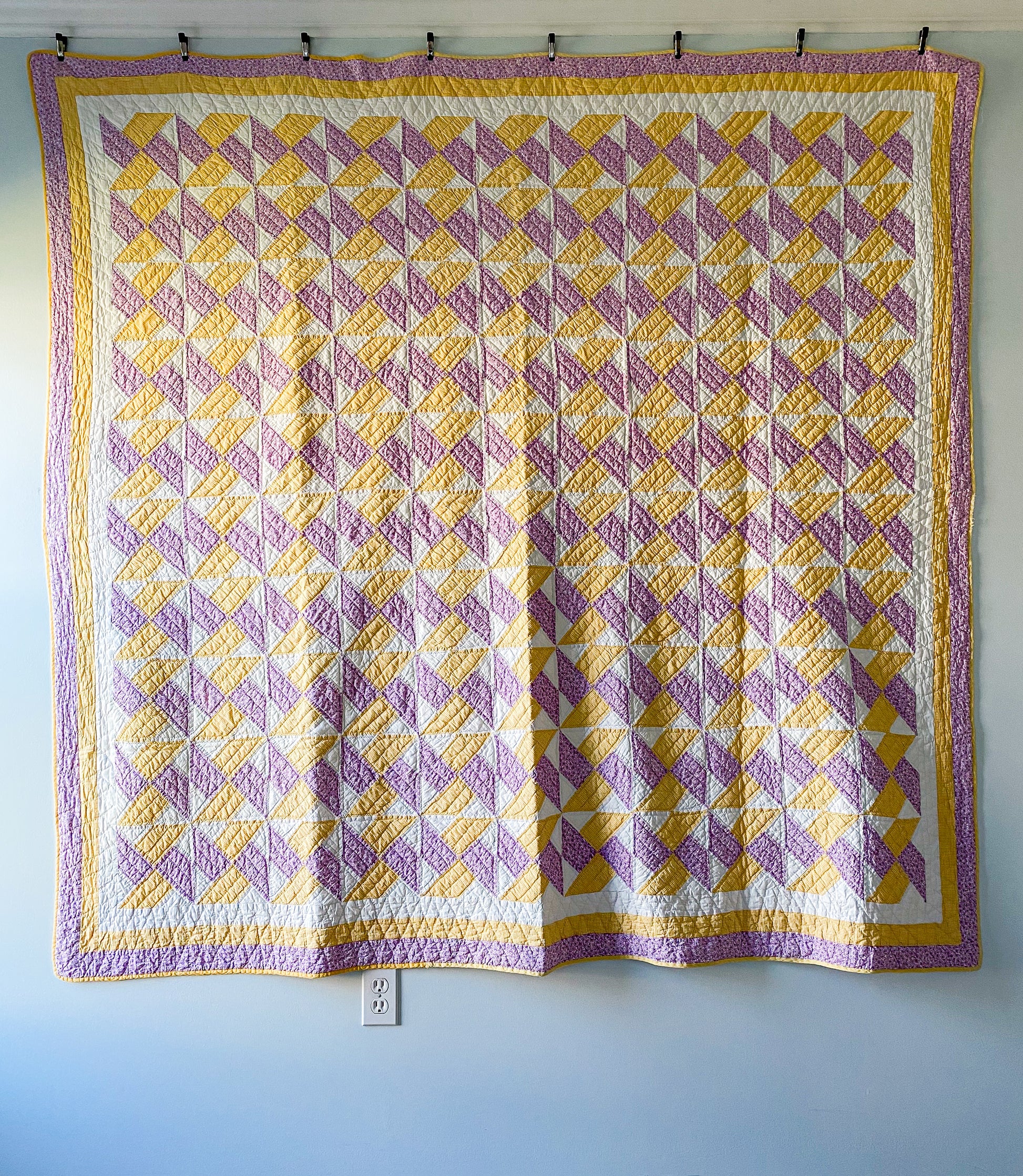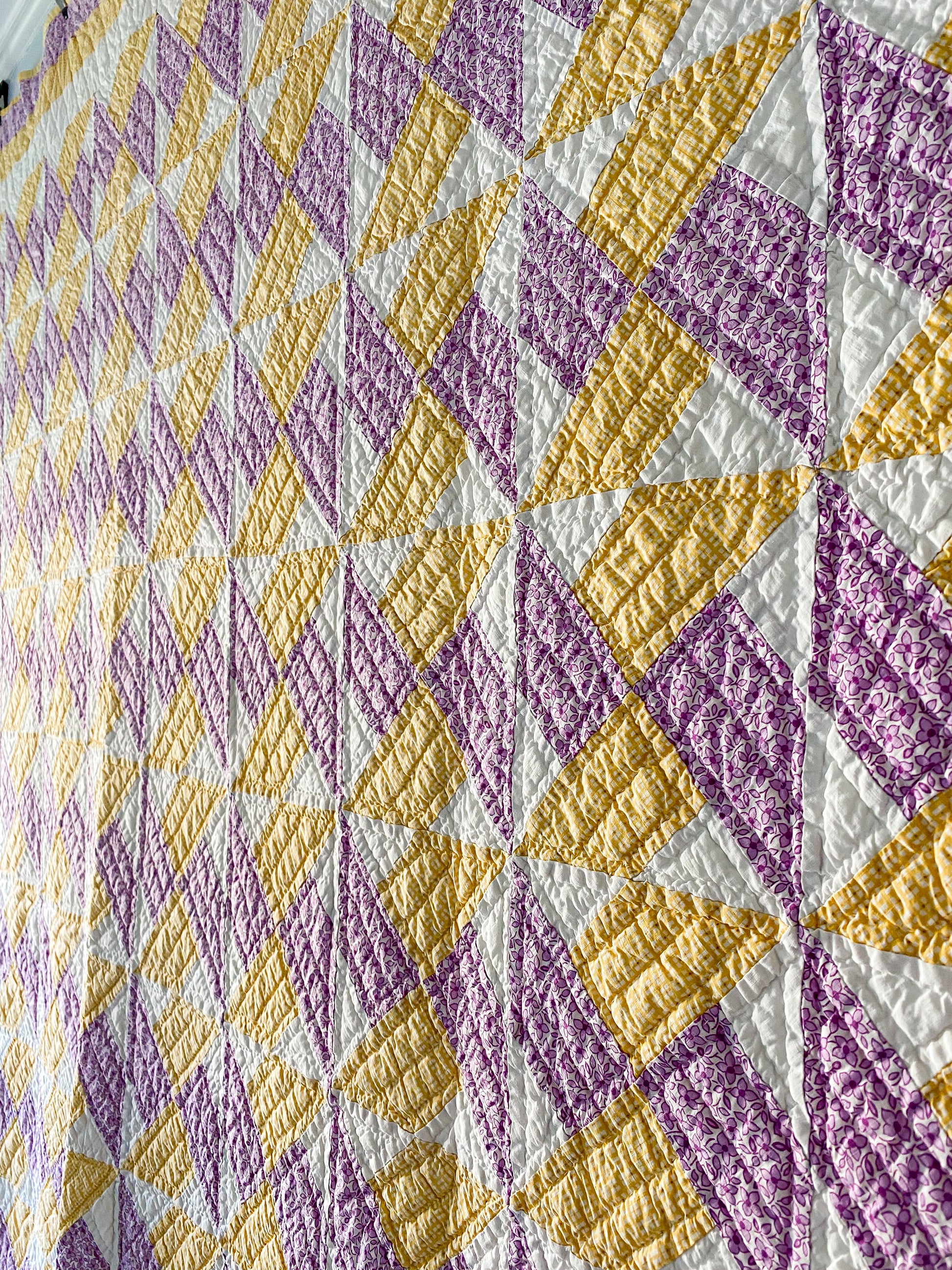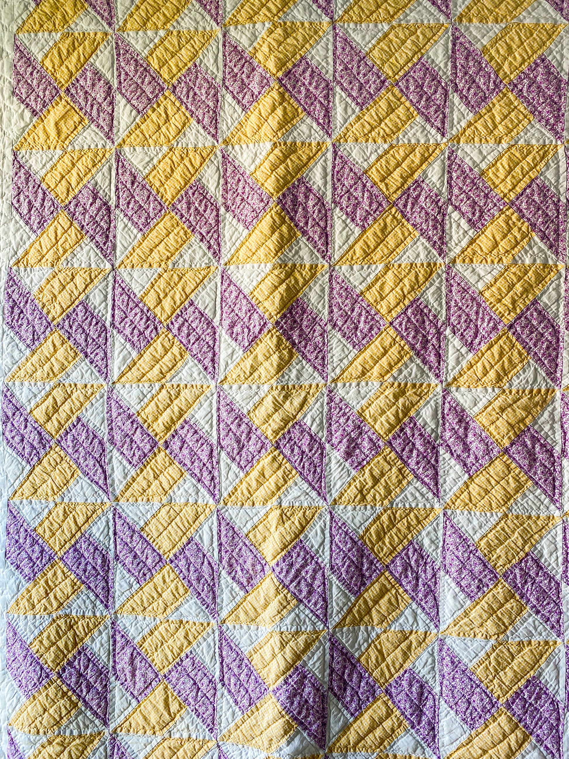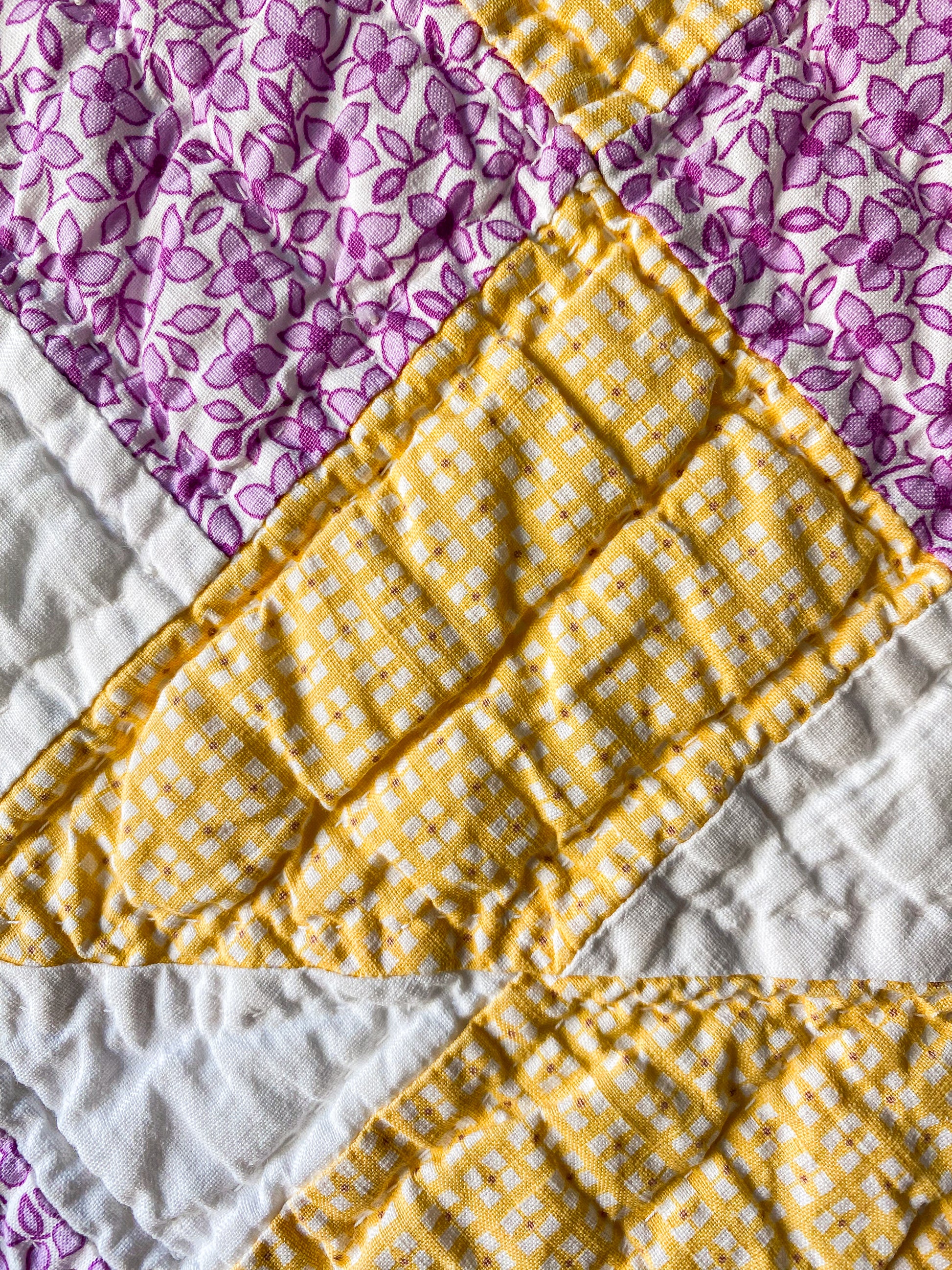 The quilt is constructed in the Twin Sisters pattern, with 2 different prints used in the blocks (the original used the same fabric in all 4 pieces). The small printed yellow grid and purple floral fabrics are set in white fabric, which also shows tiny pinwheels at the intersection of blocks.