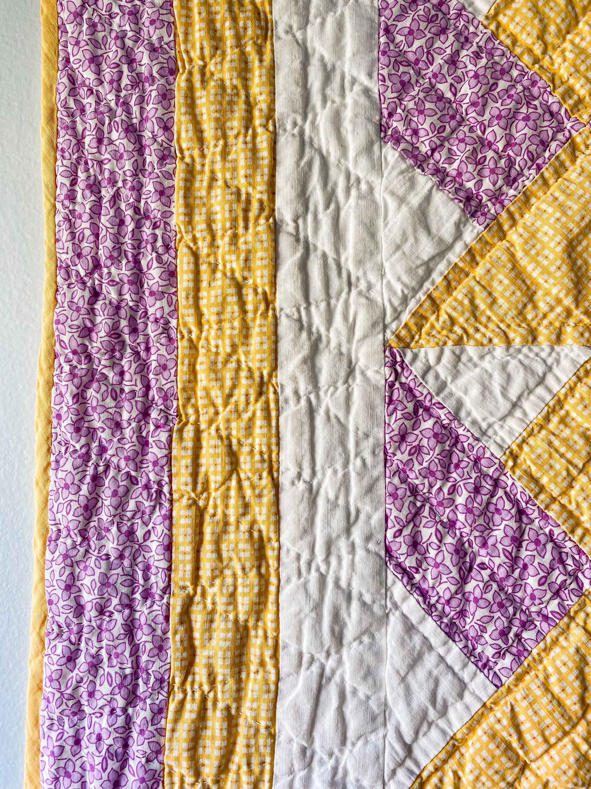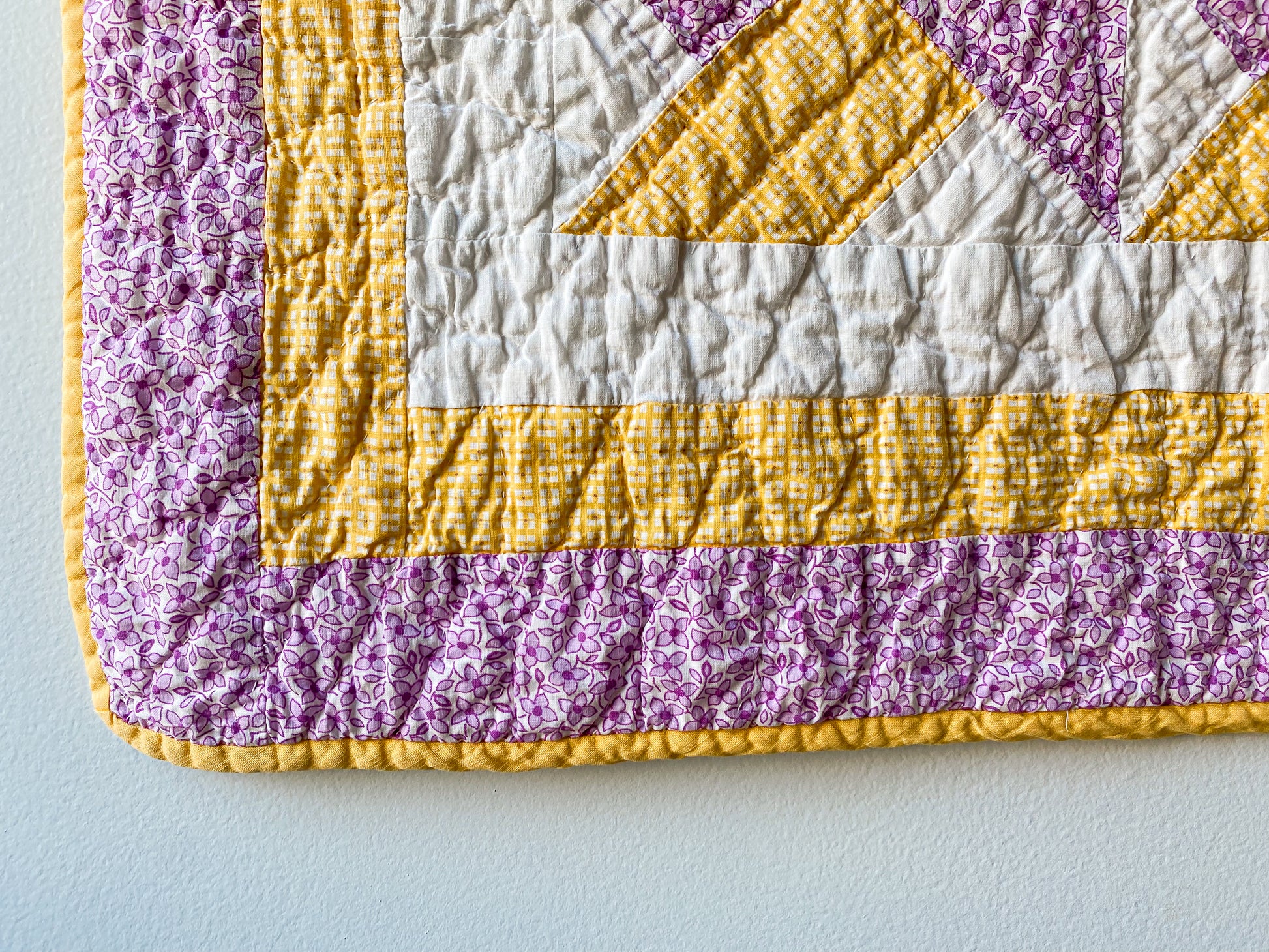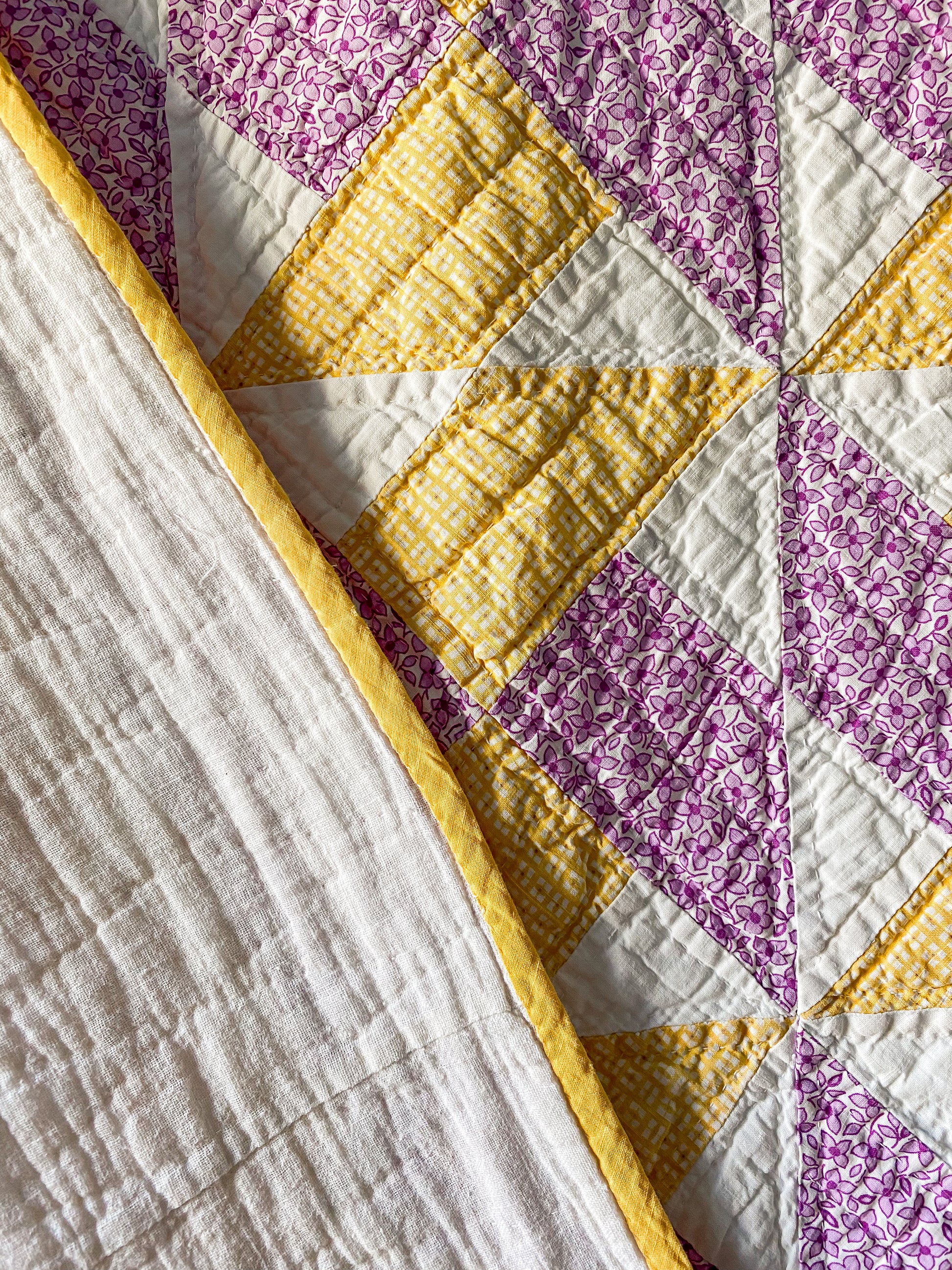 Binding is matching yellow fabric. Sashing is two rows of purple and yellow fabrics. Backing is white cotton. Lightweight cotton batting. Hand quilted in white thread.