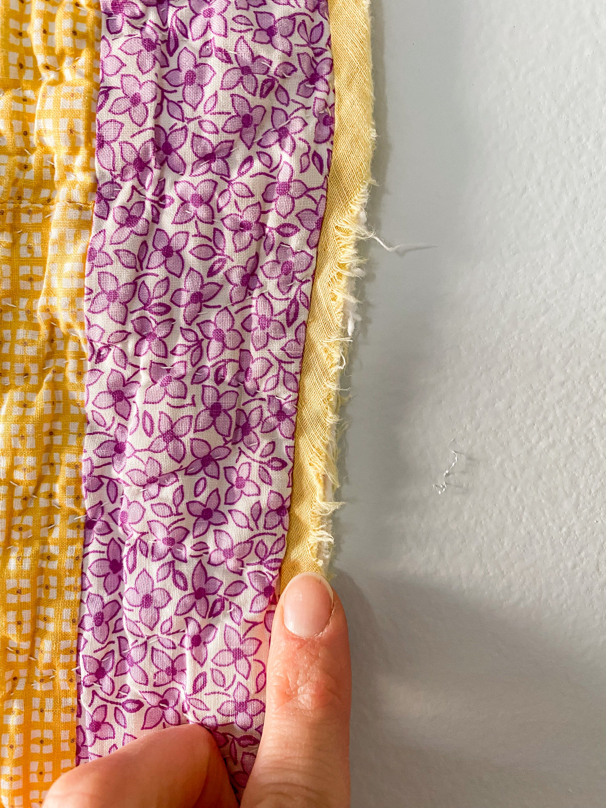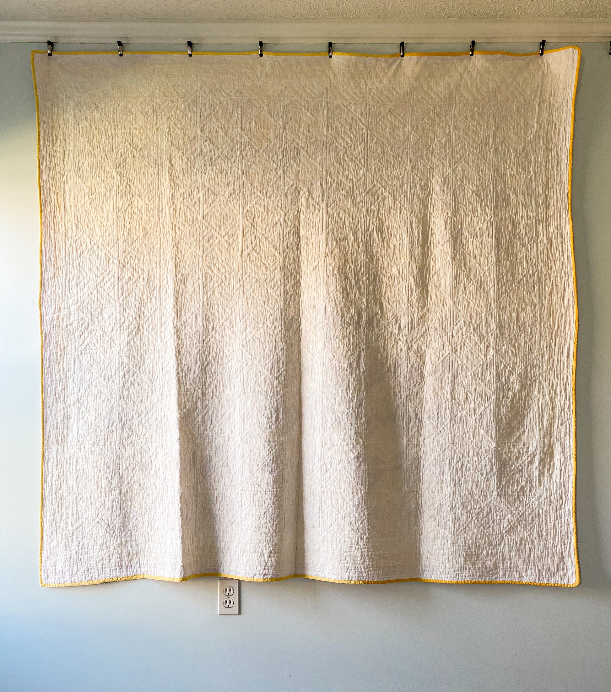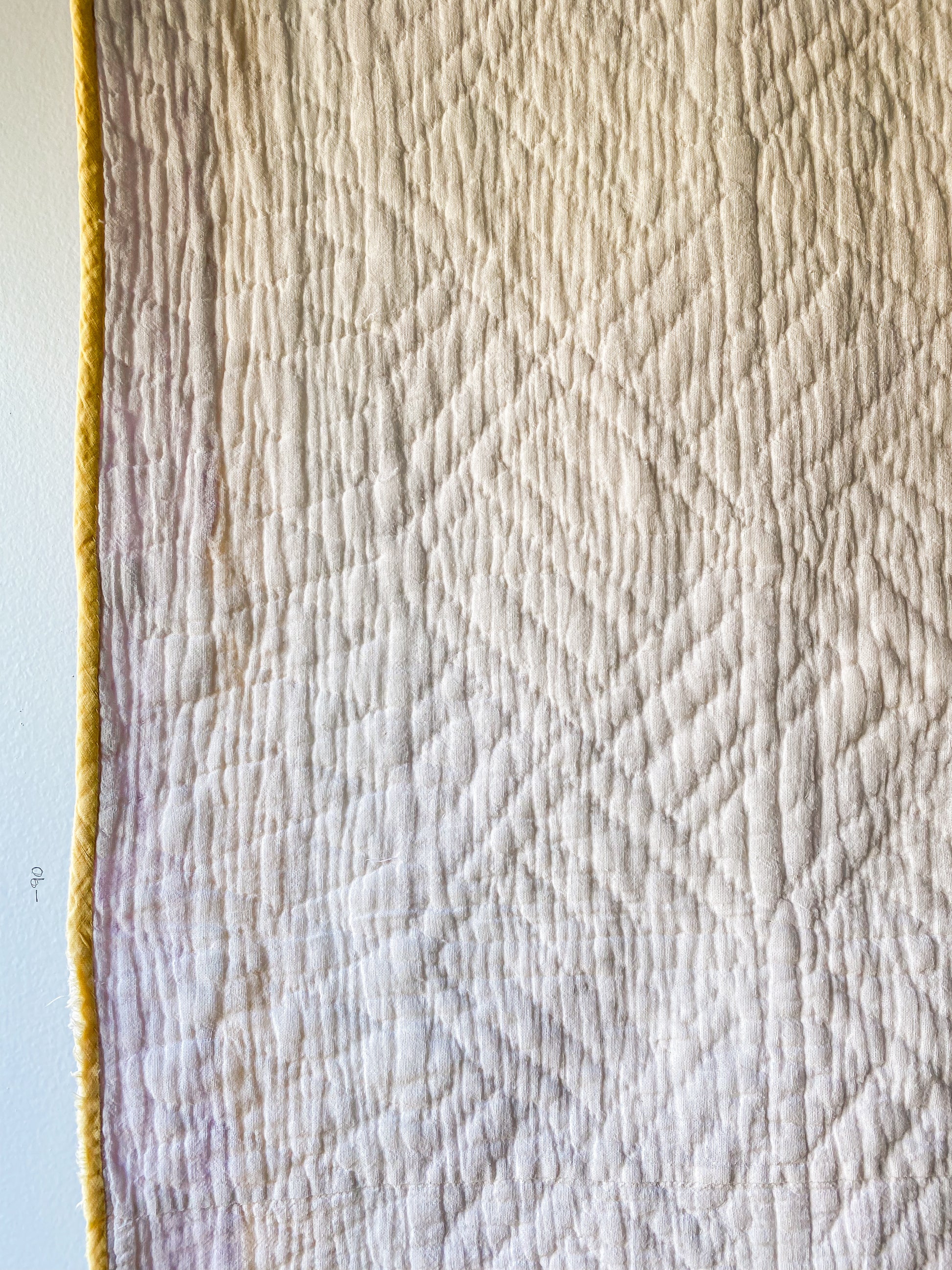 Binding is matching yellow fabric. Sashing is two rows of purple and yellow fabrics. Backing is white cotton. Lightweight cotton batting. Hand quilted in white thread.
