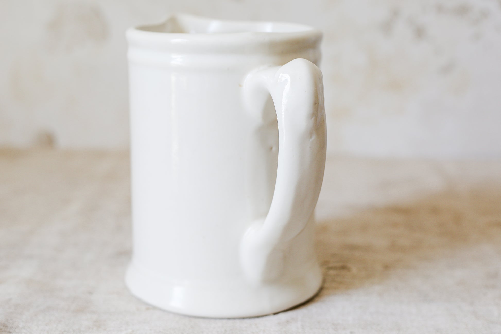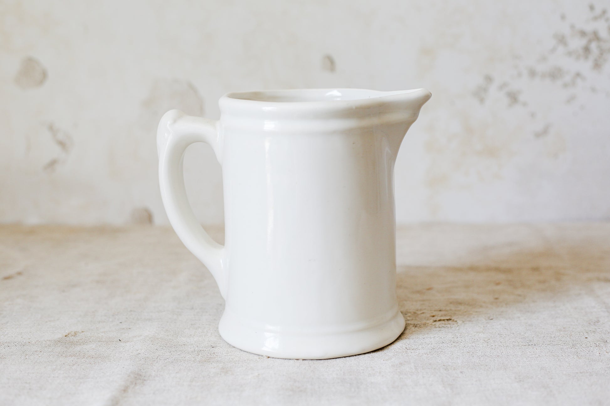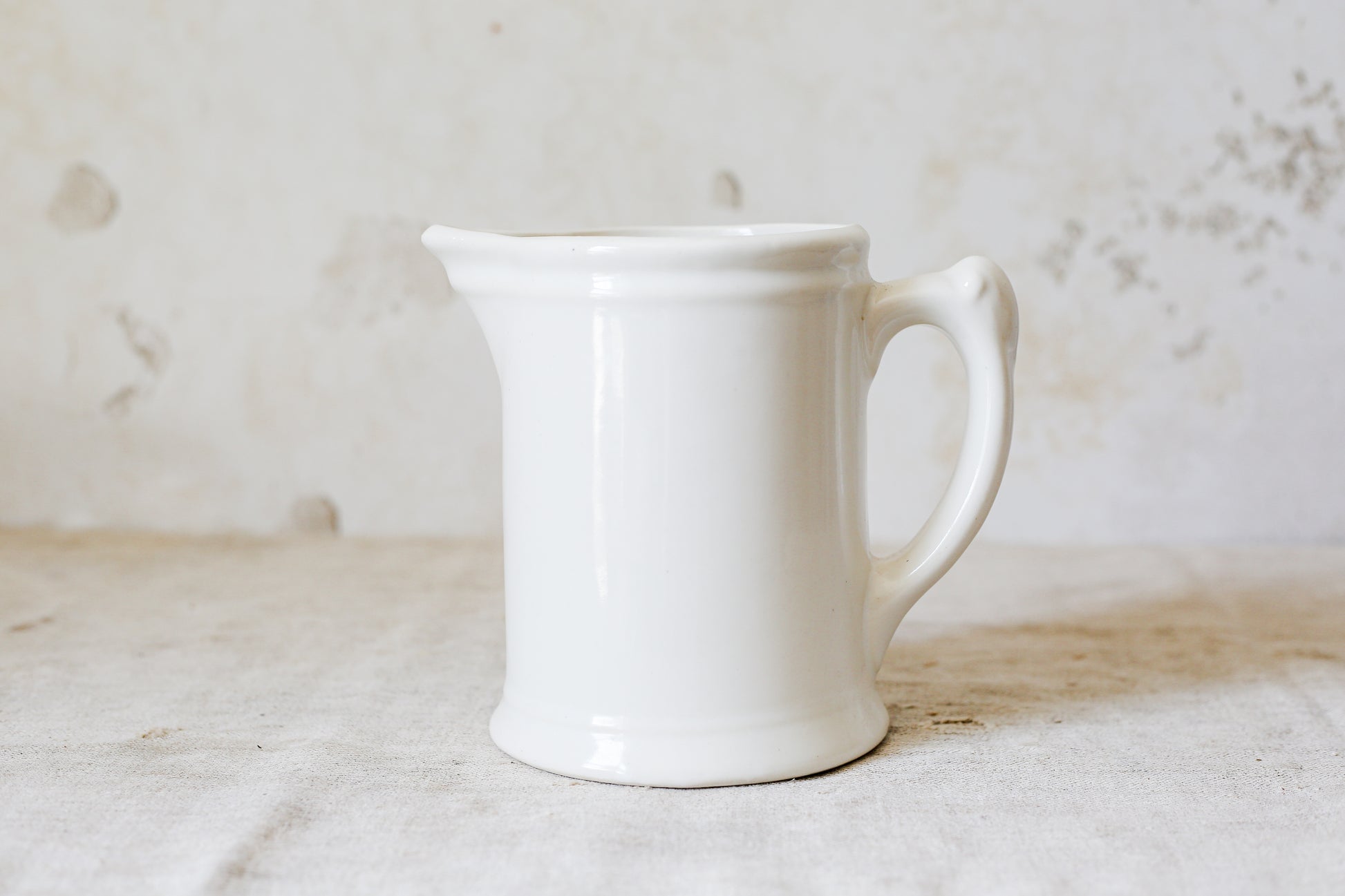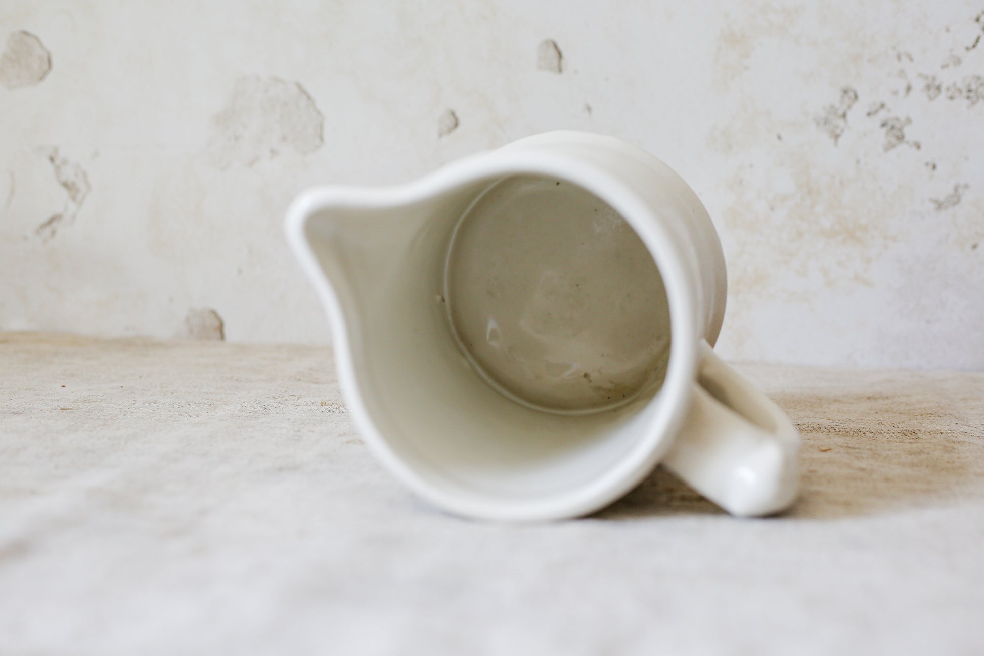 Available is a vintage unmarked white pitcher. This neutral decor pieces has a banded spout and decorative thumb rest on the handle. Its heavy stoneware makes it perfect for holding large floral bouquets.