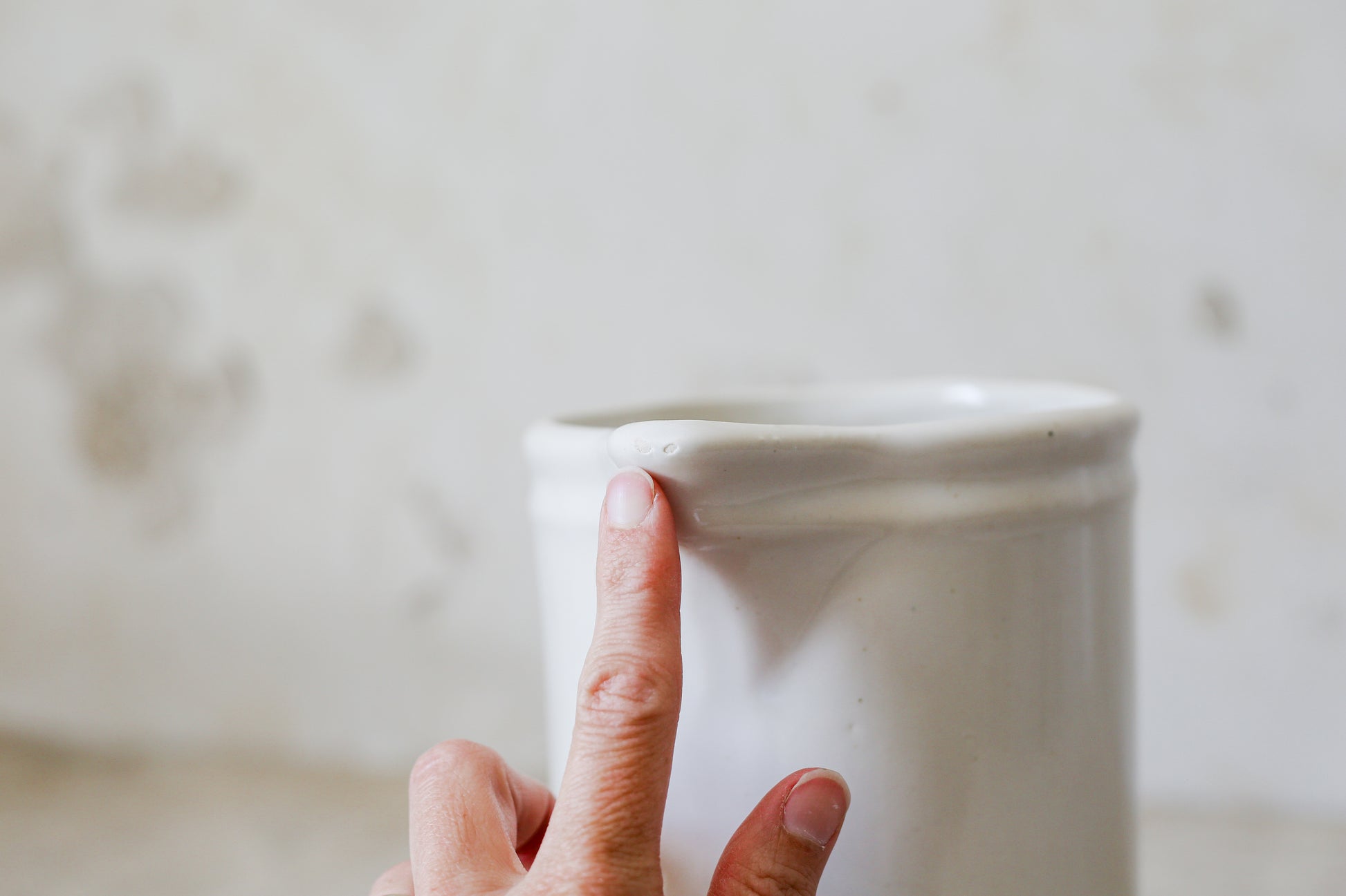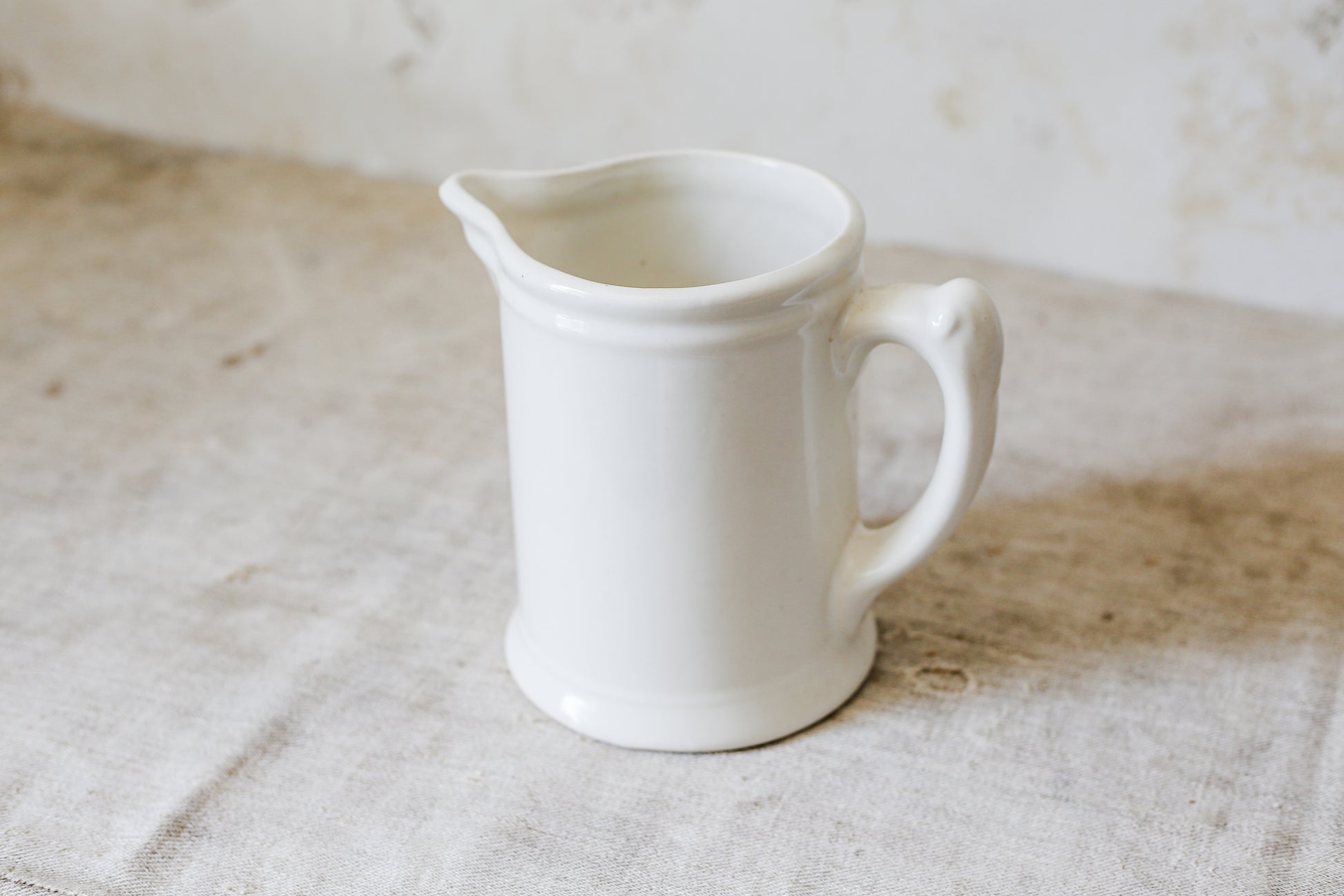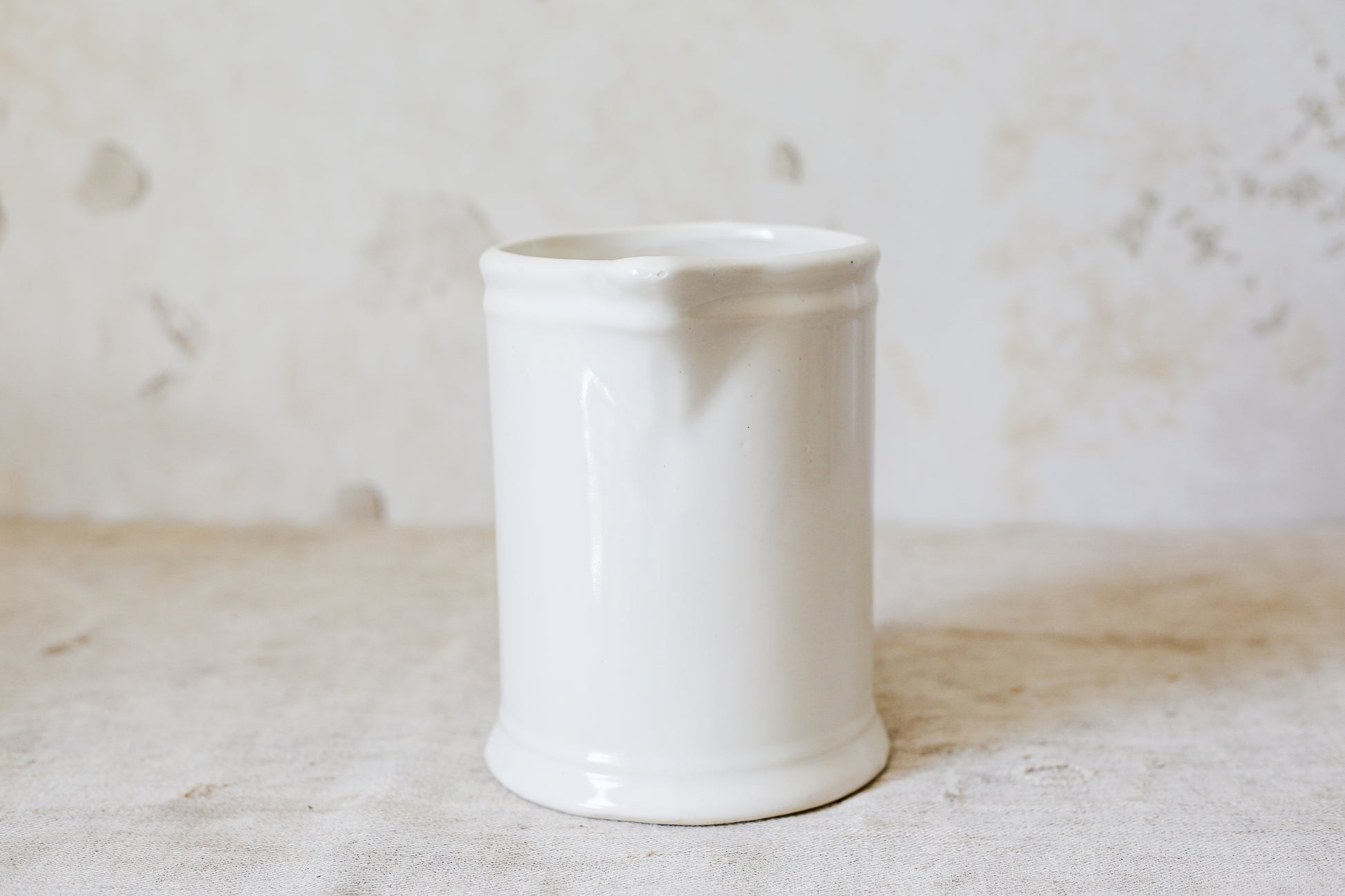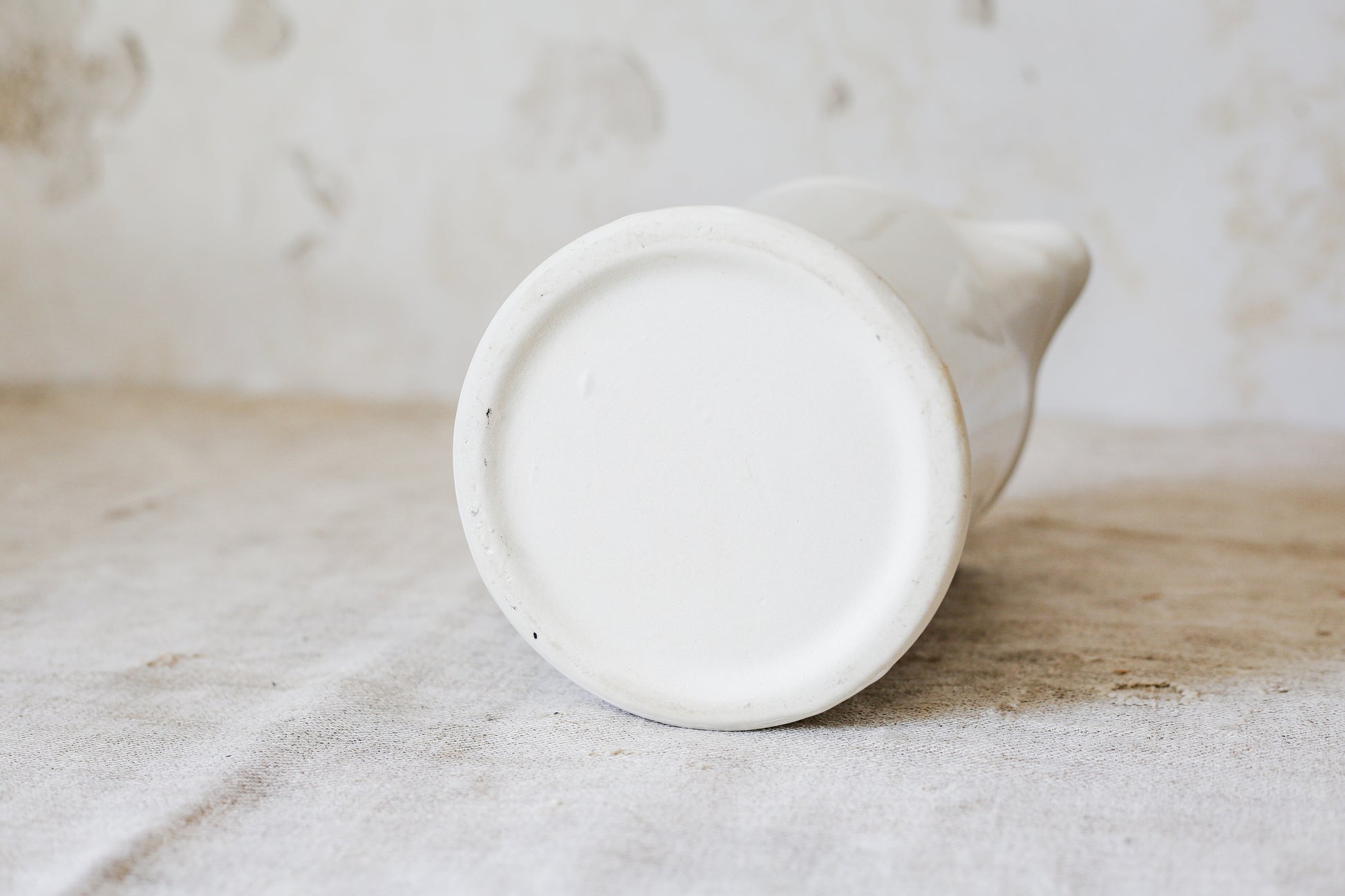 Available is a vintage unmarked white pitcher. This neutral decor pieces has a banded spout and decorative thumb rest on the handle. Its heavy stoneware makes it perfect for holding large floral bouquets.