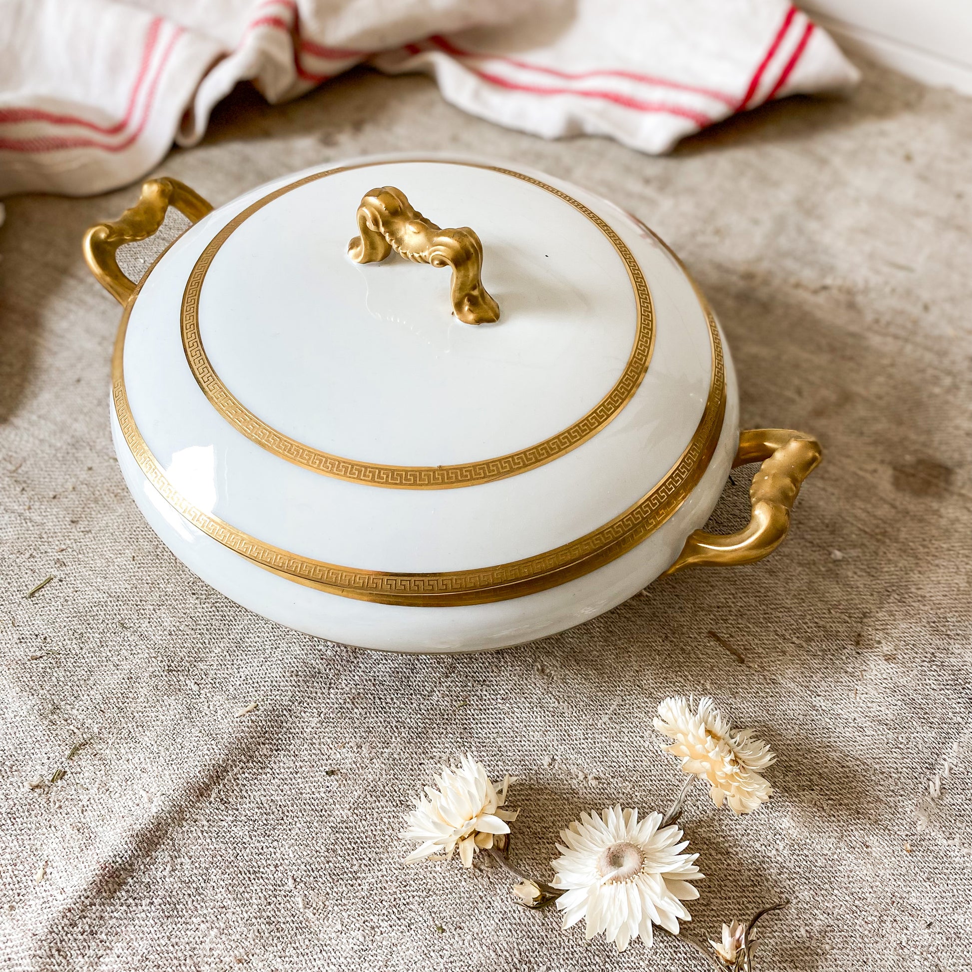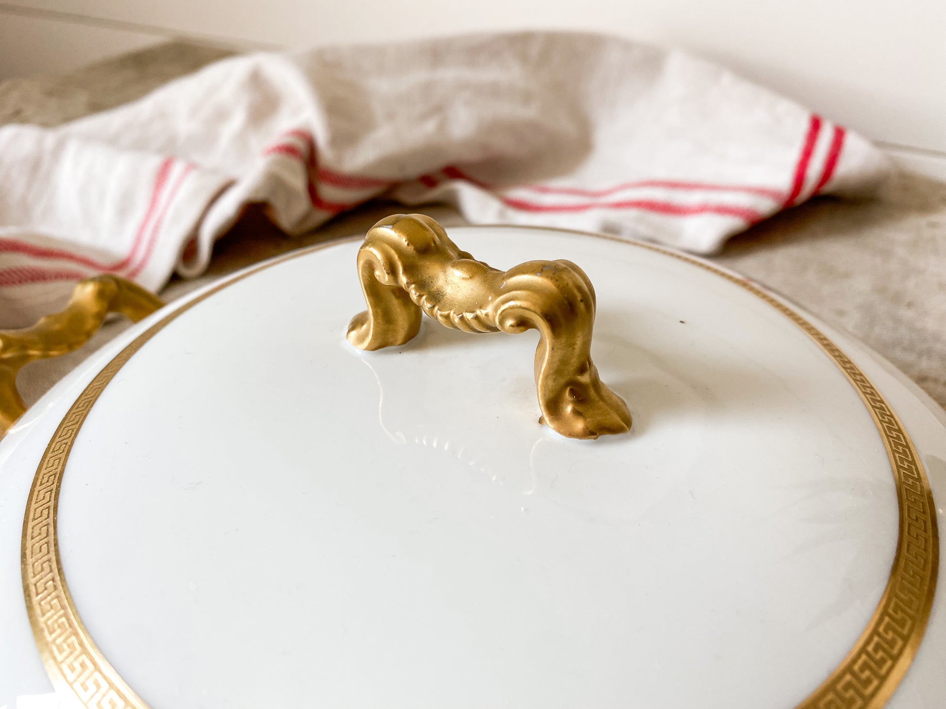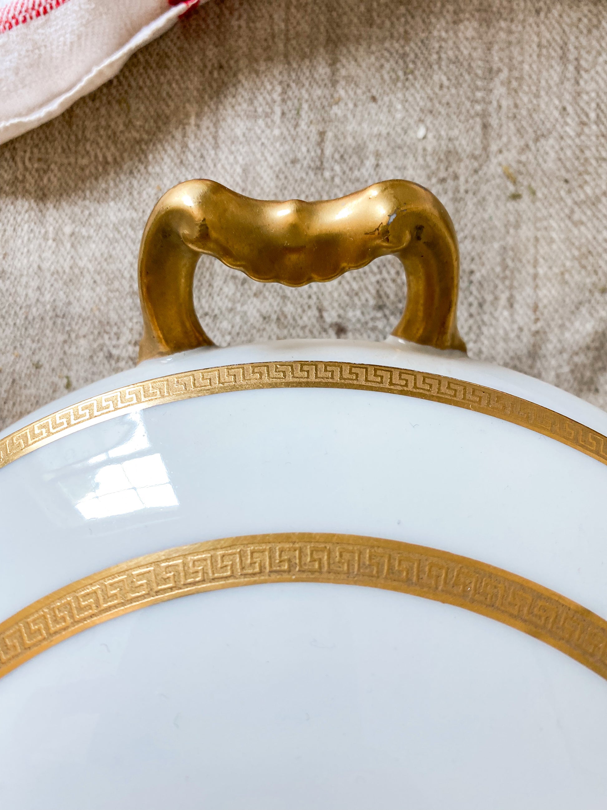Vintage round porcelain serving dish in white with gold Greek key detail along rims and handles. Beautiful condition, ready for use on your table.