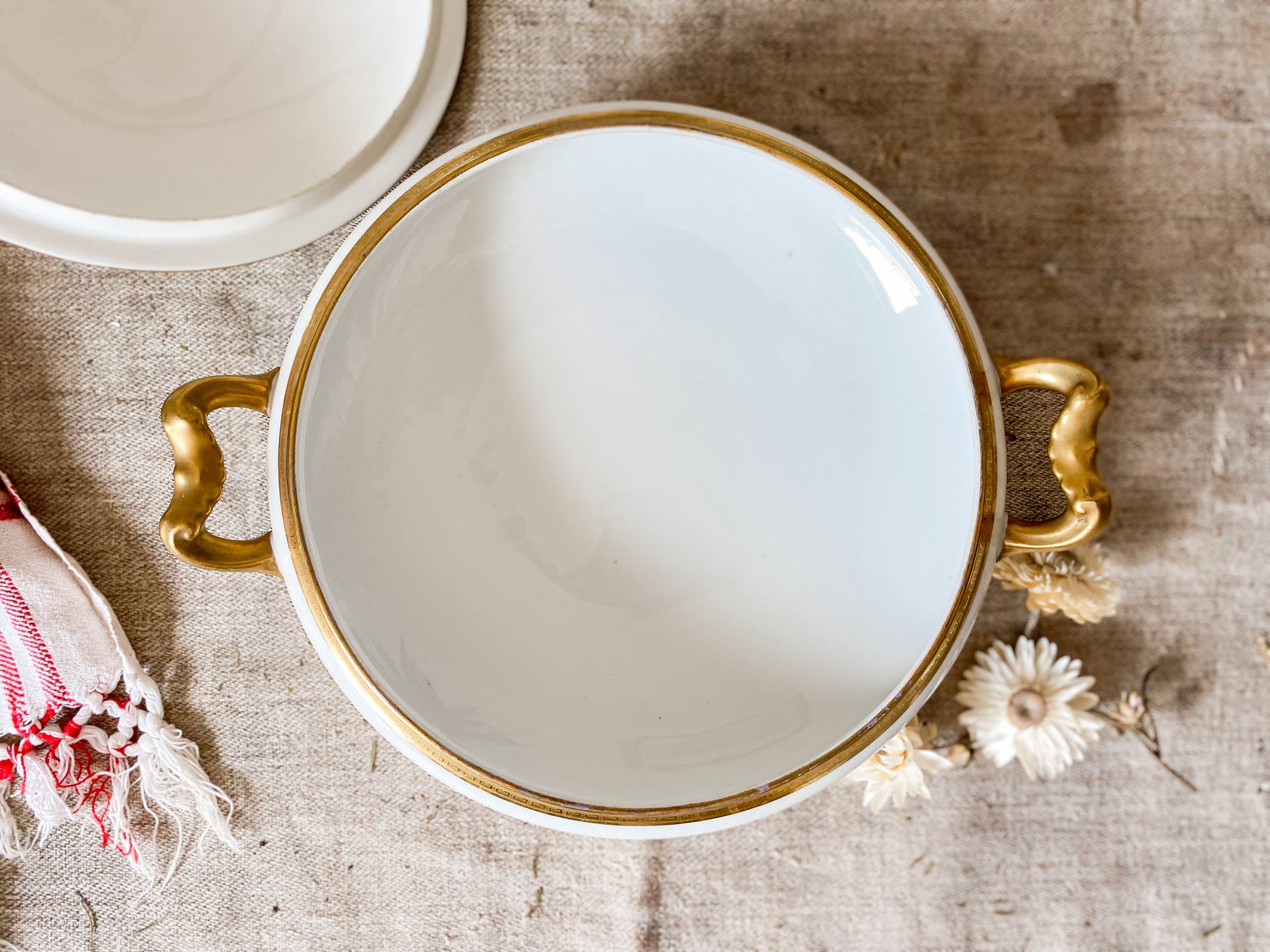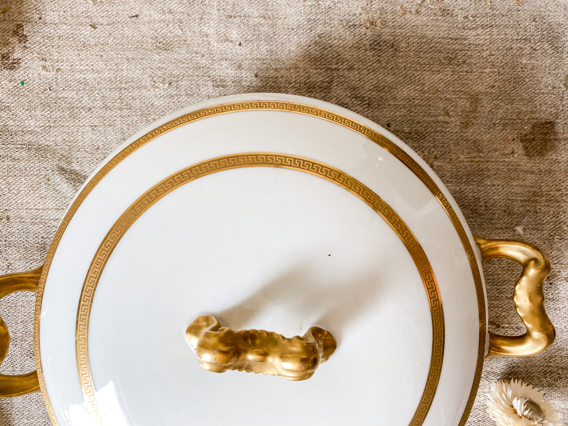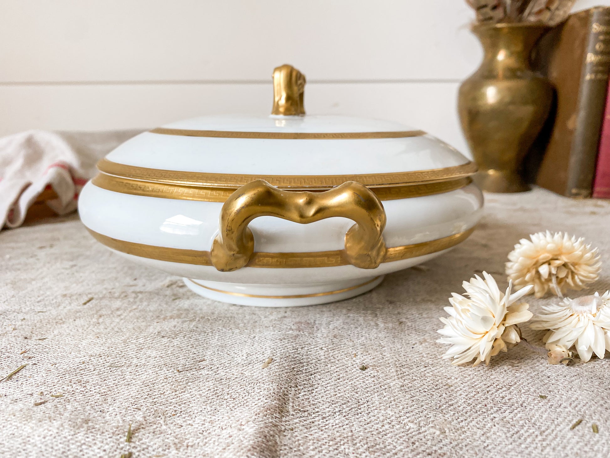 Vintage round porcelain serving dish in white with gold Greek key detail along rims and handles. Beautiful condition, ready for use on your table.