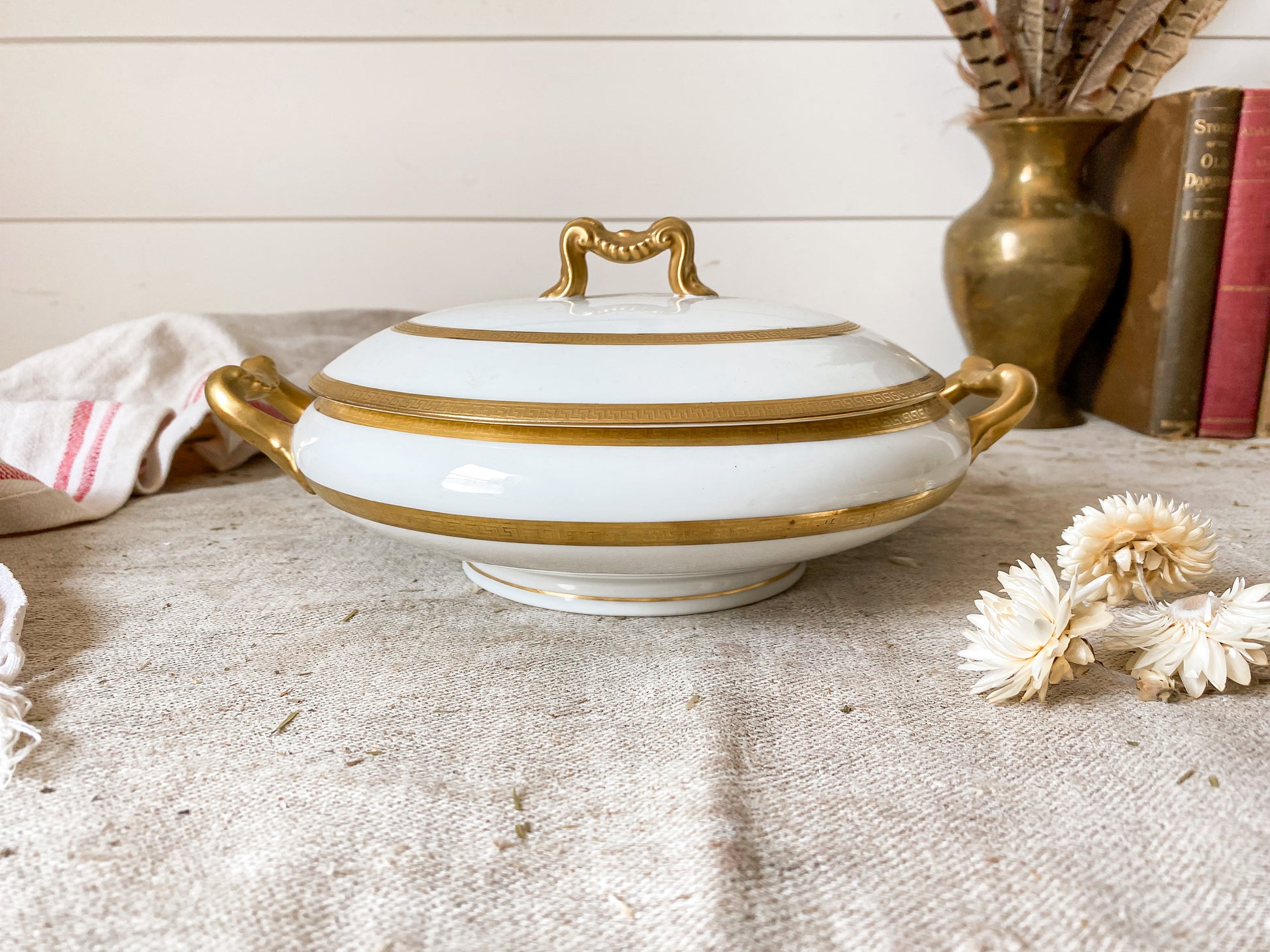 The lid and handles have a draped gold detail. The edges of the lid and body have a gold trim that has light wear. No chips, cracks, breaks or crazing.
