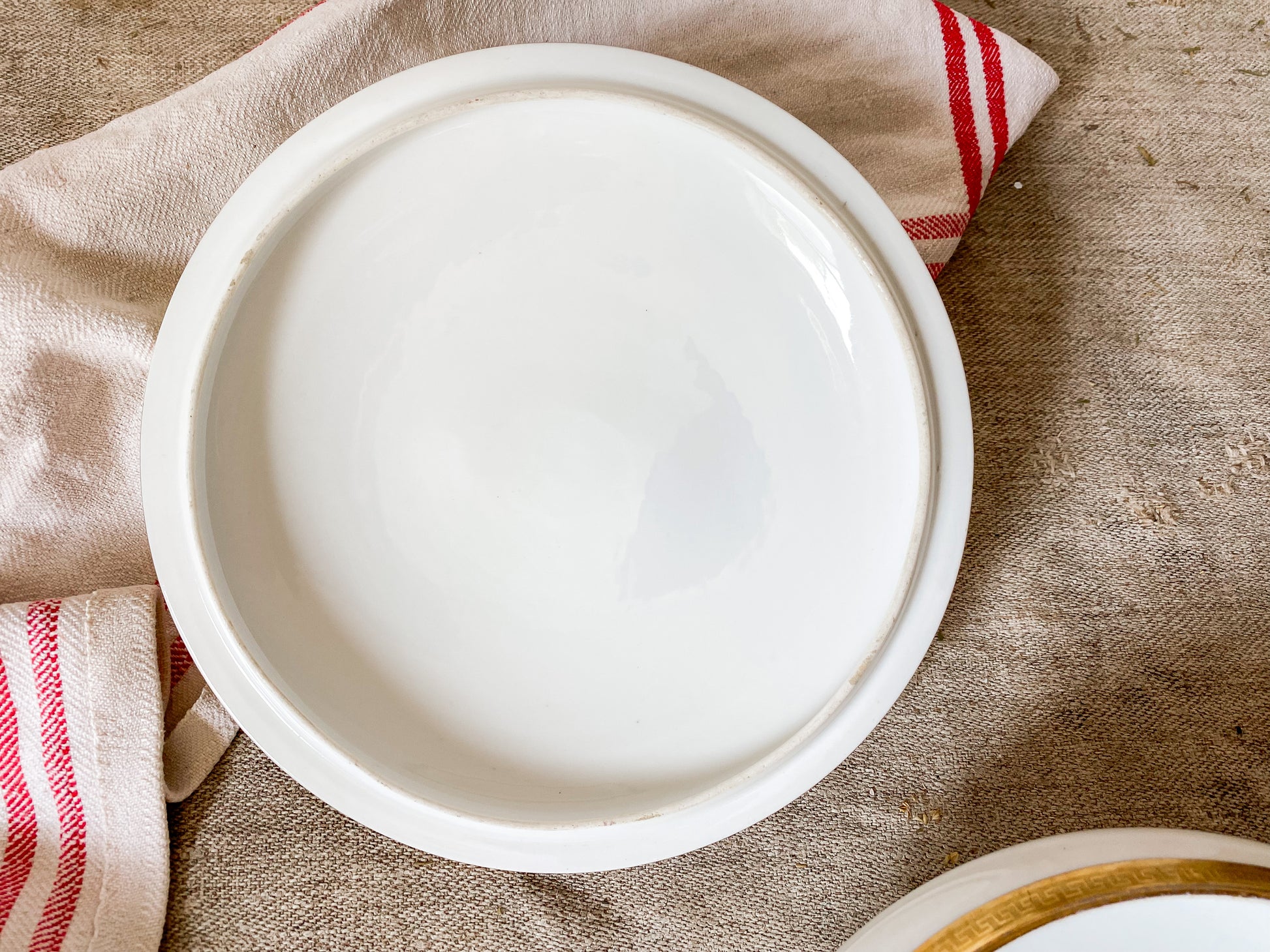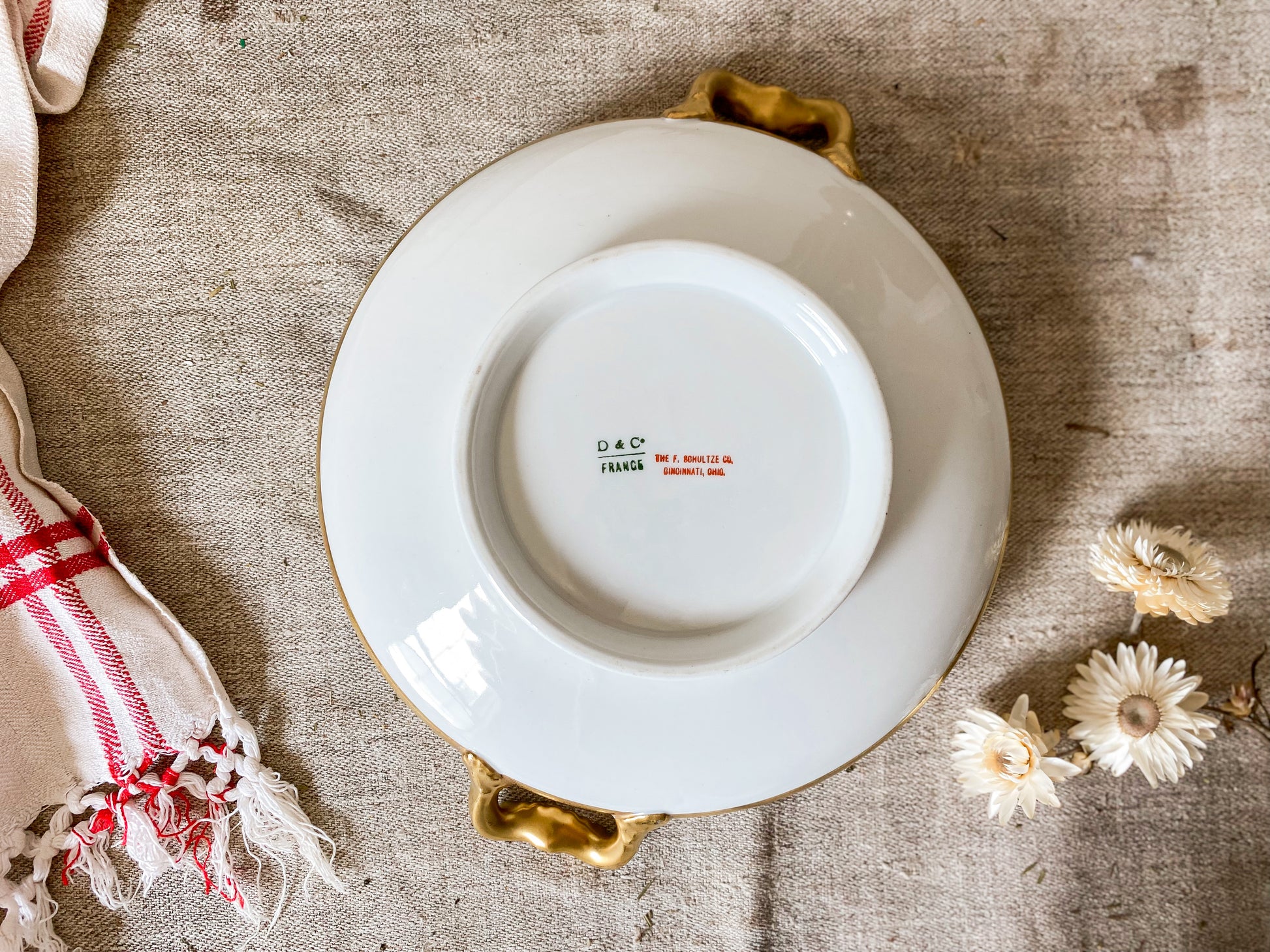 Vintage White French Porcelain Round Serving Dish with Gold Trim | D & C France