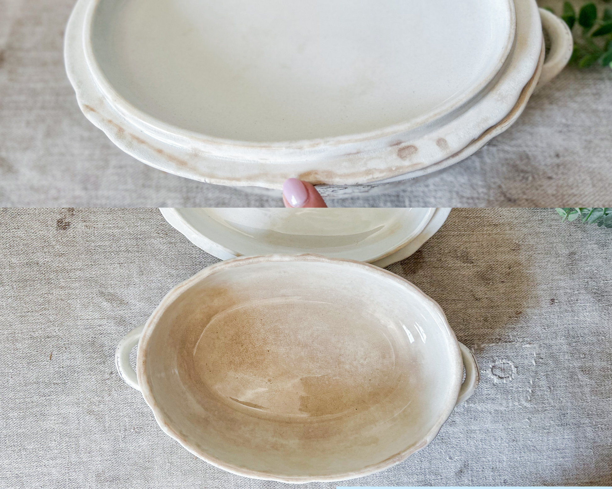 Overall light to moderate staining and crazing, especially in the interior. Transfer design shows ivy leaves and flowers.
