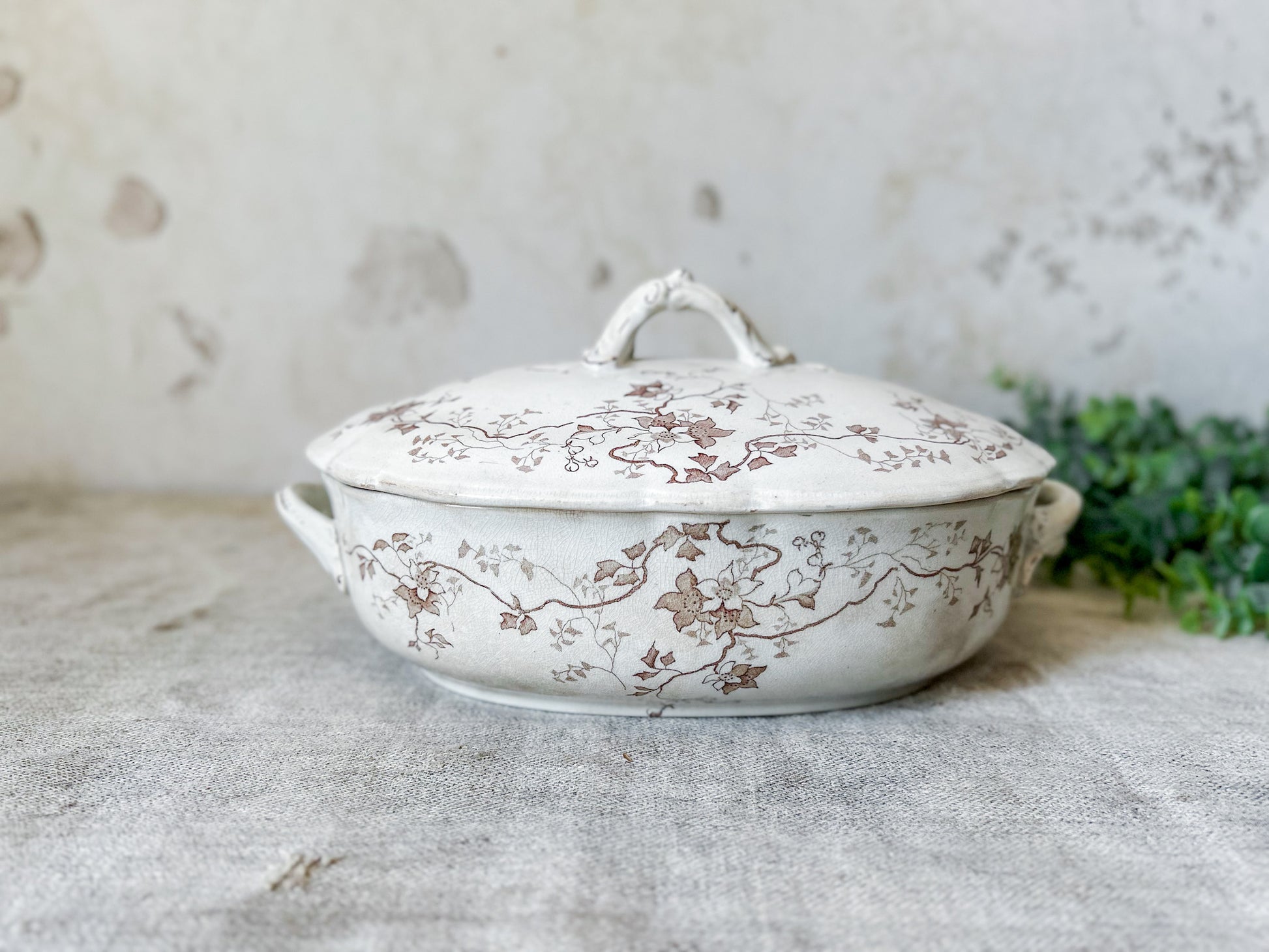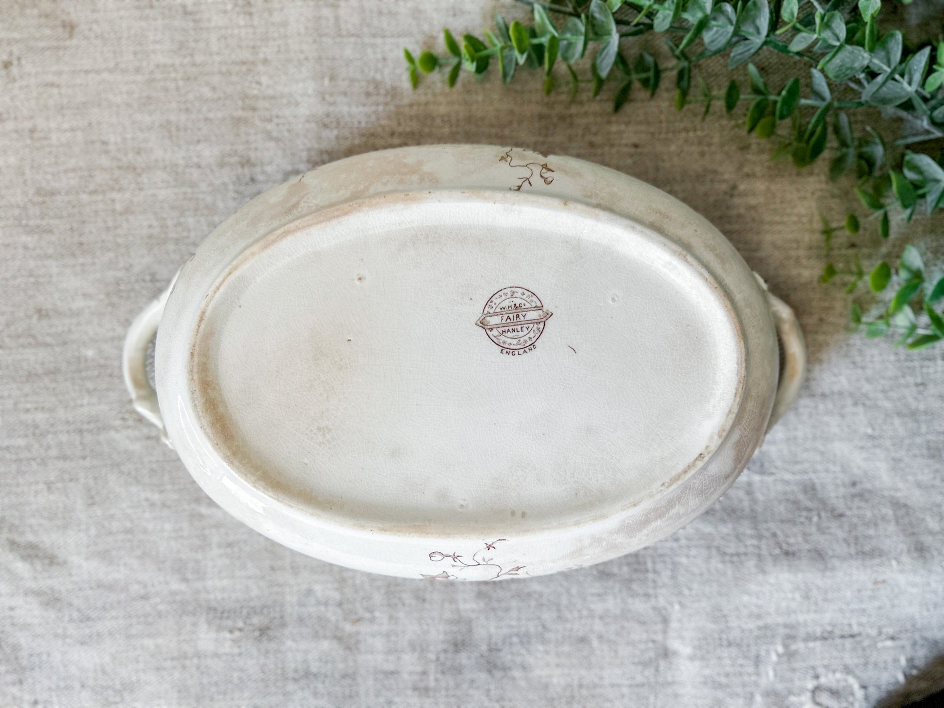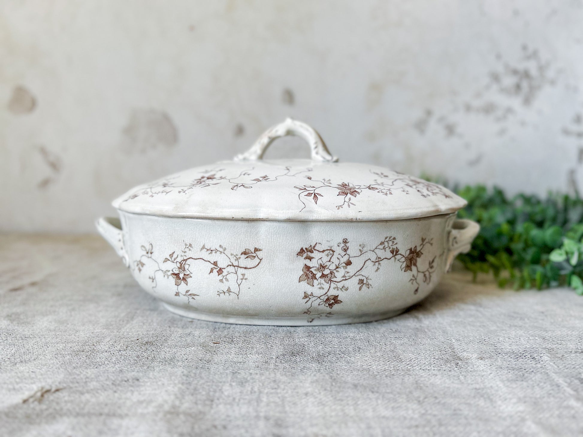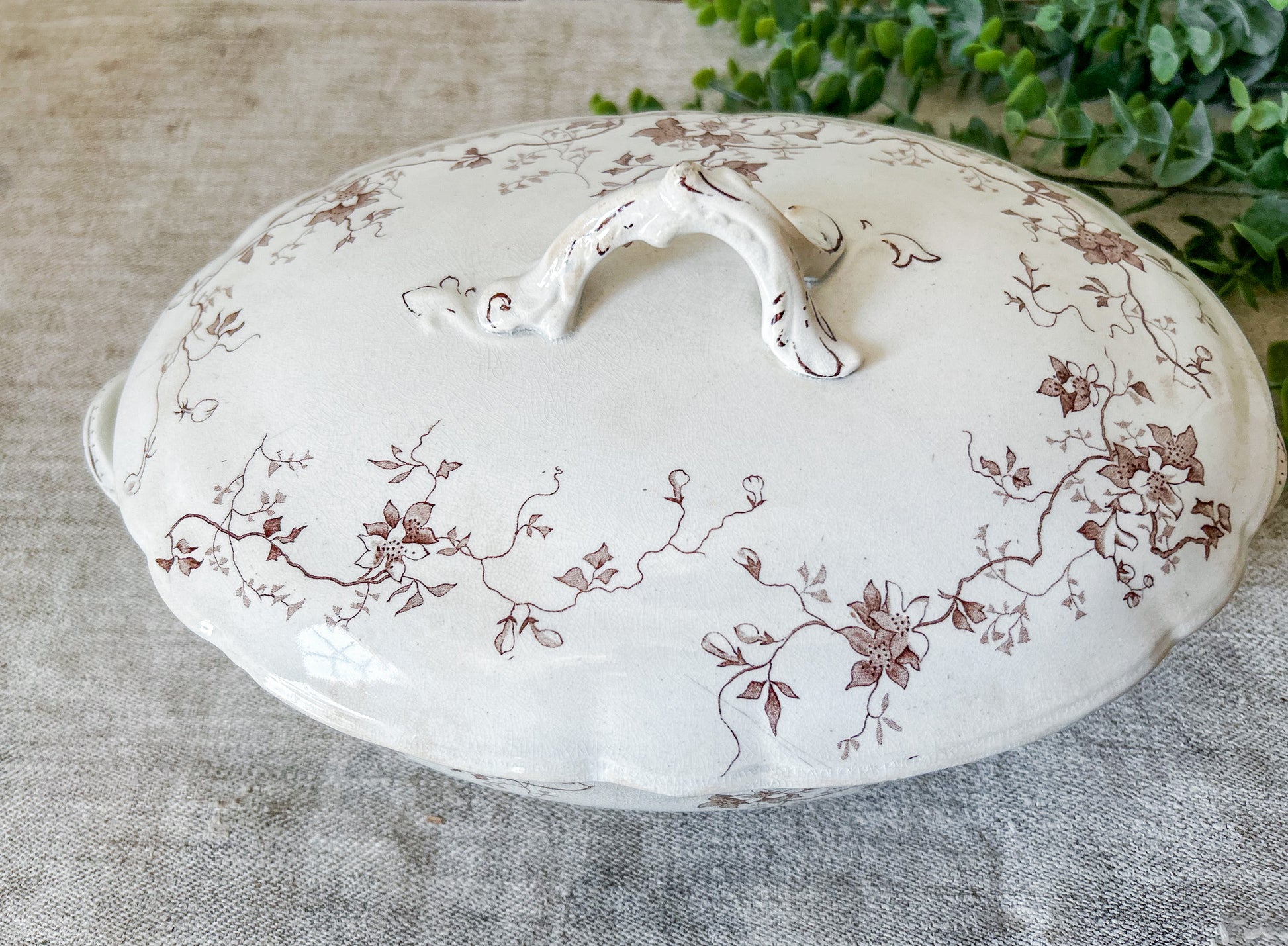 Available is an antique ironstone tureen with delicate floral brown transferware pattern. The backstamp identifies this piece as produced by Whittaker, Heath & Co. in Hanley, England, between 1892-1898. Pattern named "Fairy" in stamp.