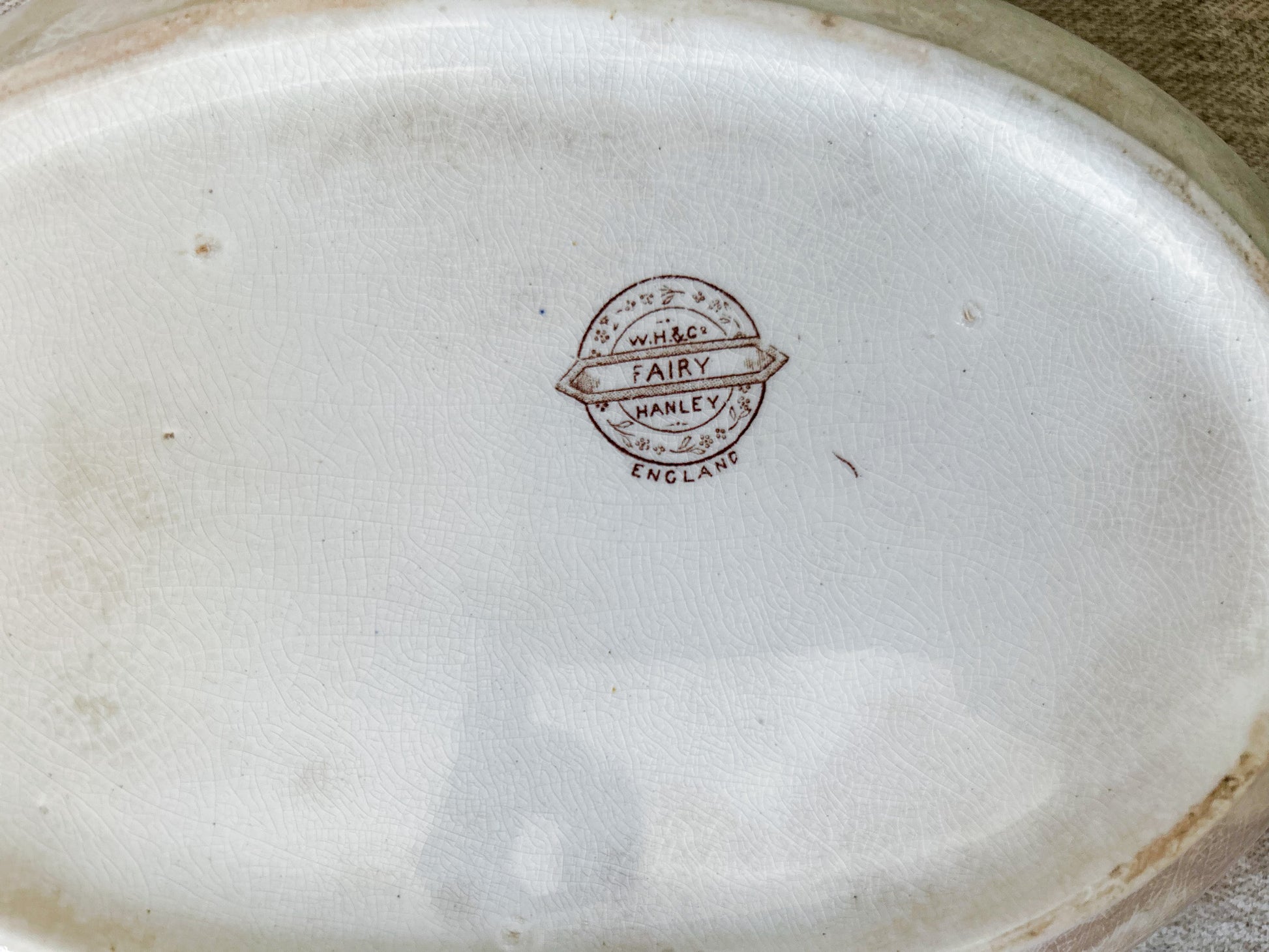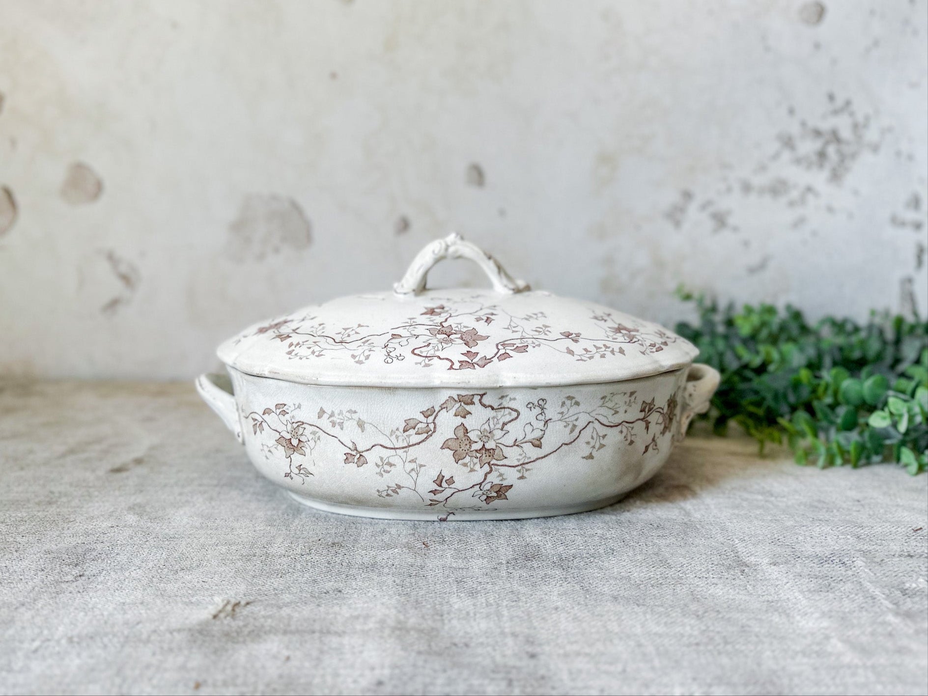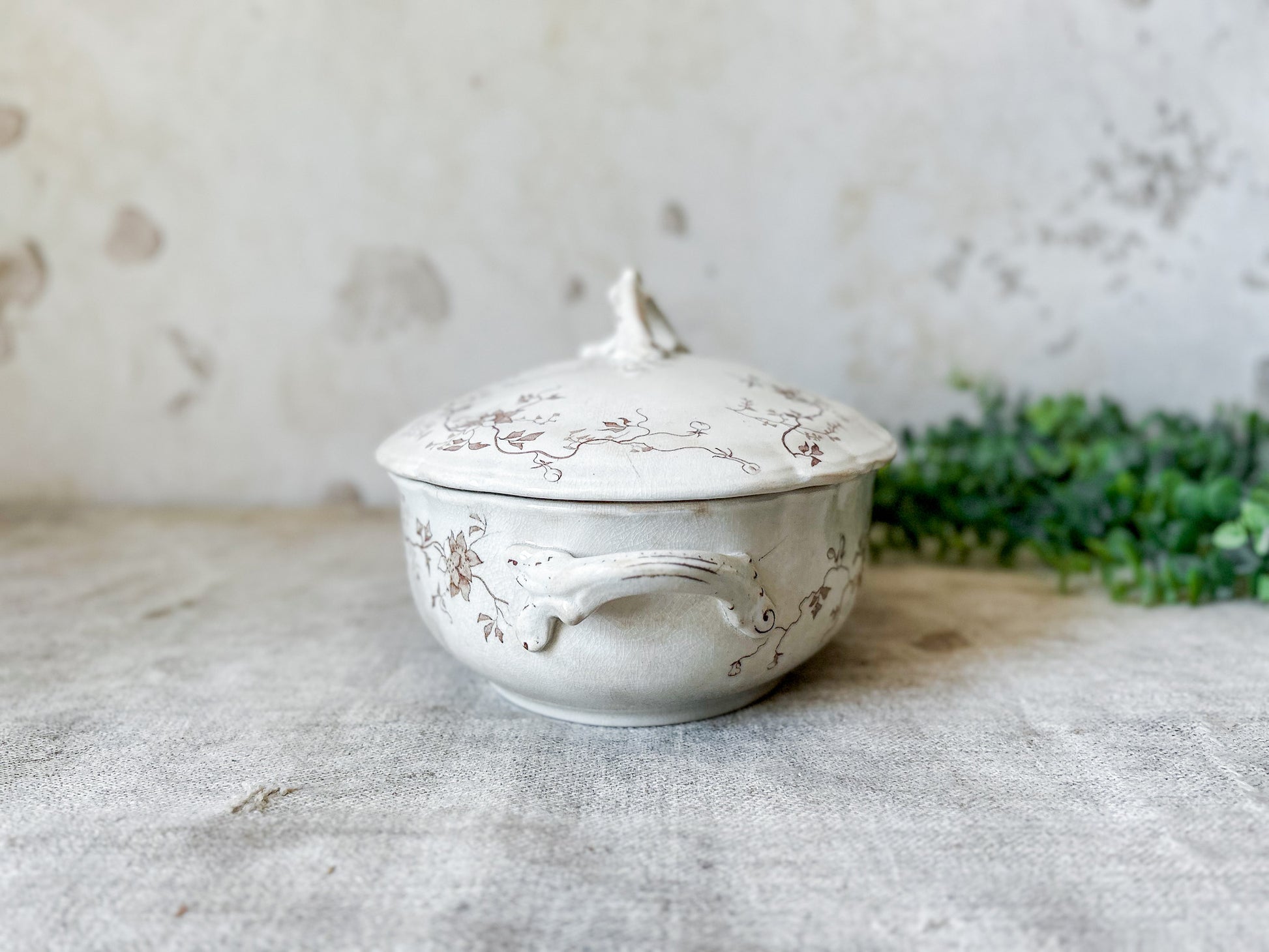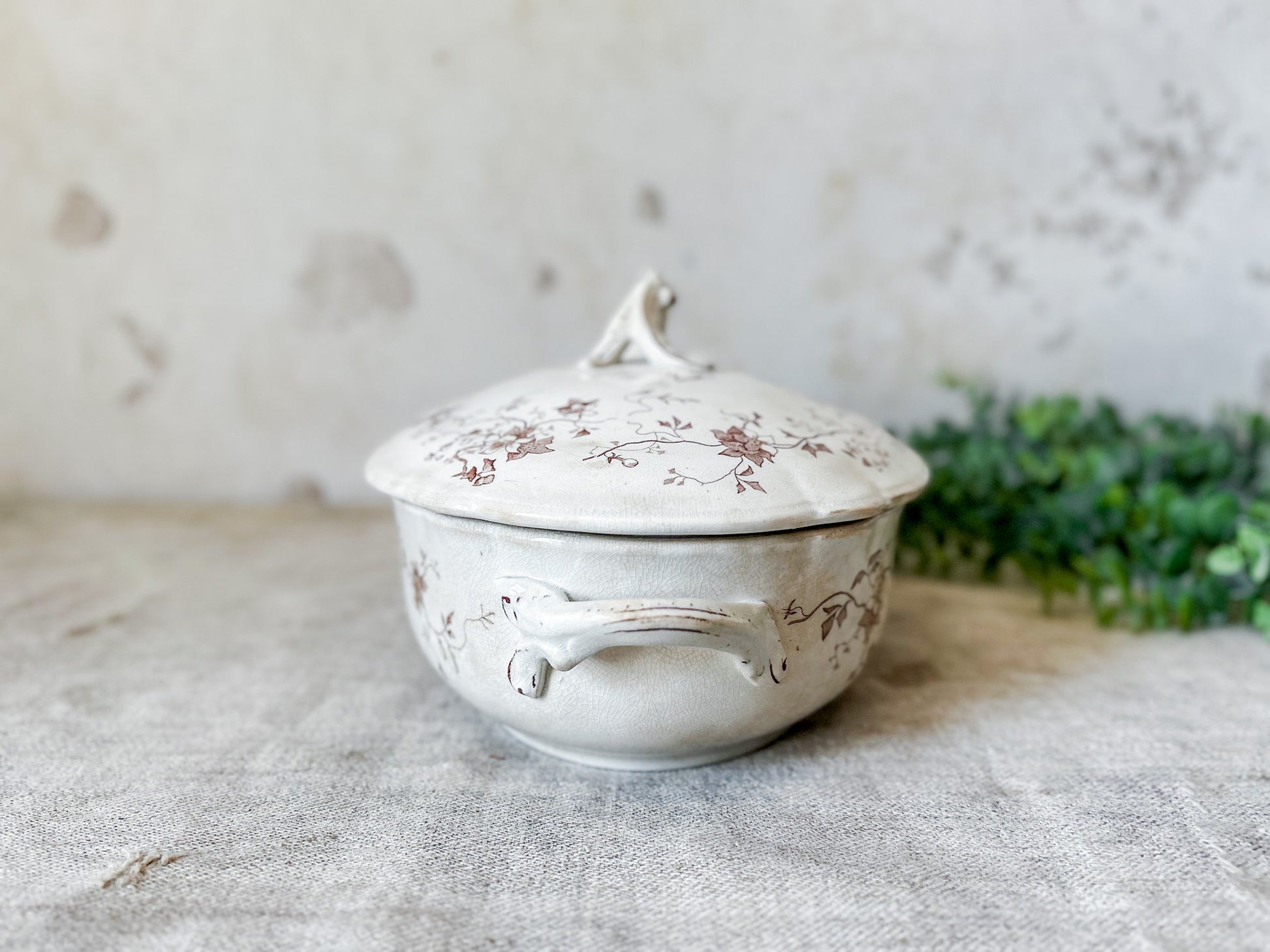 Available is an antique ironstone tureen with delicate floral brown transferware pattern. The backstamp identifies this piece as produced by Whittaker, Heath & Co. in Hanley, England, between 1892-1898. Pattern named "Fairy" in stamp.