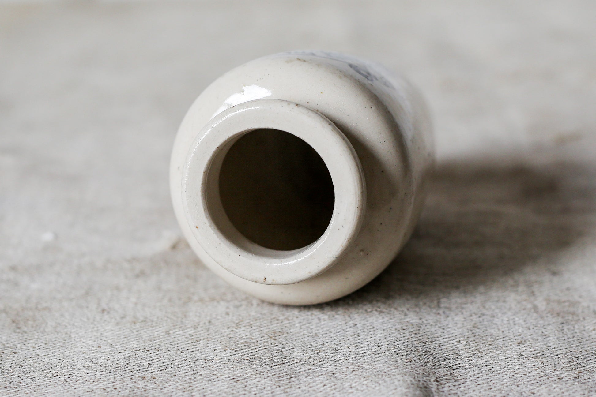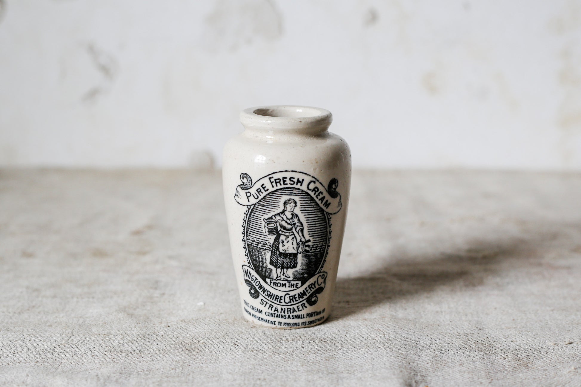 Antique stoneware cream pot with attractive strong black graphics, showing a dairy maid. Script reads "Wigtownshire Creamery Co. Stranraer".
